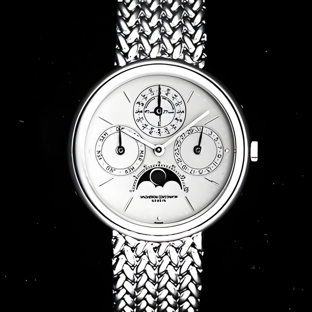 A Vacheron Constantin timepiece in the grand tradition of watchmaking. It features a seiwinding movement with a perpetual calendar and the phases of the moon. The movement also includes a tiny gear for displaying February 29th on leap years - it therefore takes four years to make a complete revolution. Case and bracelet in 18K yellow gold. (VACHERON CONSTANTIN)
