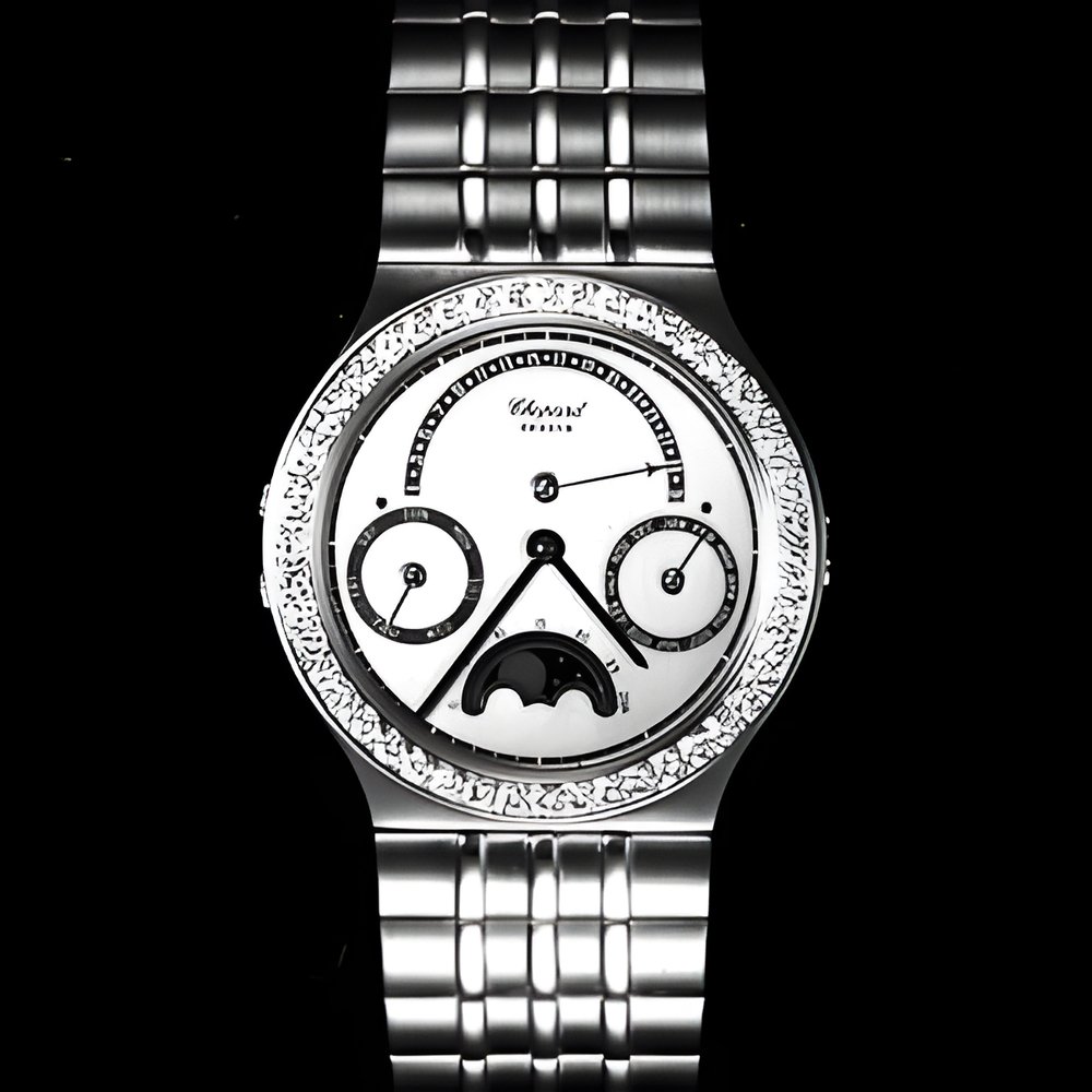 Classic lines housing a sophisticated seifwinding mechanical movement that includes a perpetual calendar showing the date, day of the week, month and phases of the moon. Automatic display of February 29th on leap years. Its bracelet and water-resistant case (toa depth of 30 m) are fashioned from 18K white and yellow gold. Diamond-set bezel. (CHOPARD, Geneva)