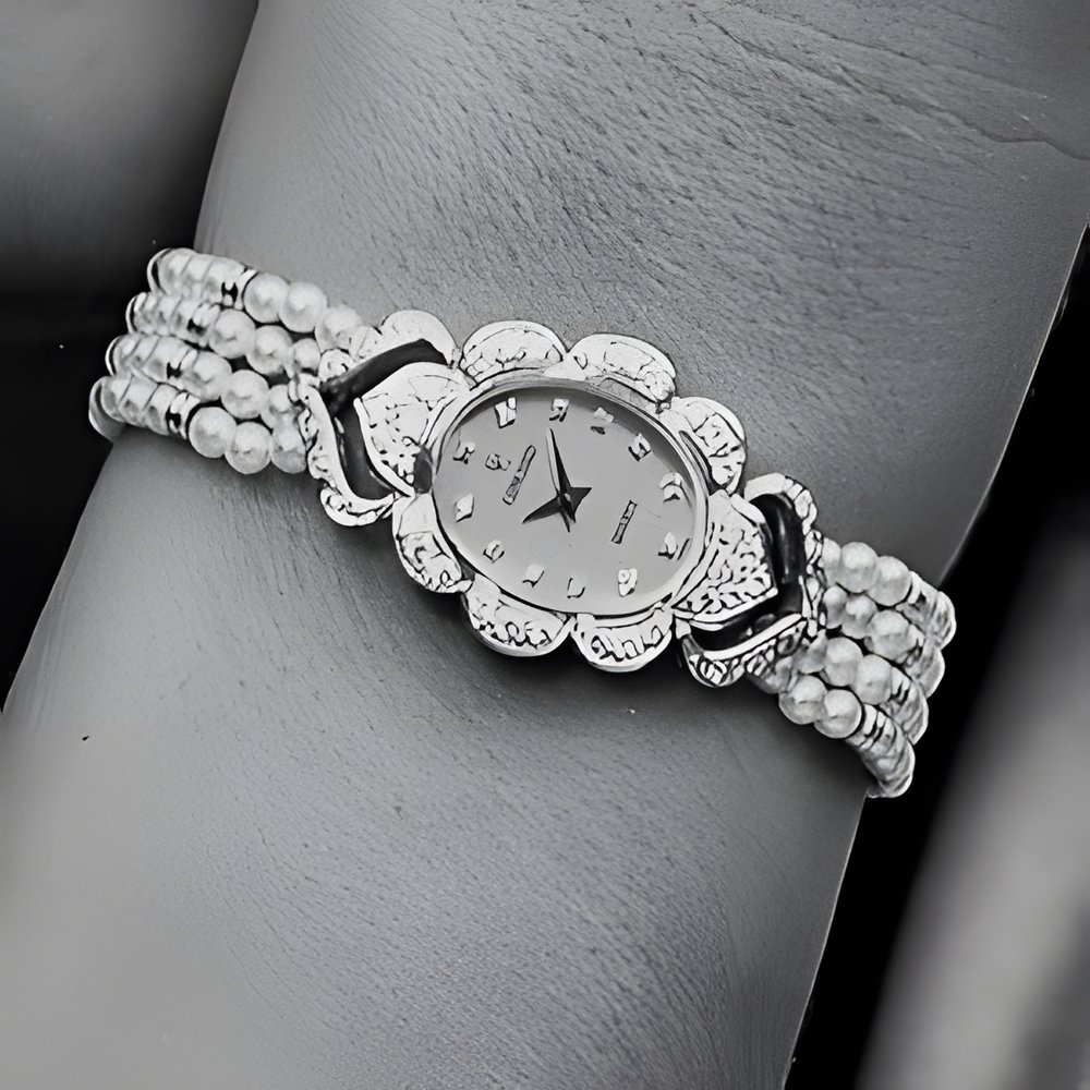 This Concord jewellery watch with elliptical dial aperture features a yellow gold decorative pattern enhanced with diamond pavé. The same motif appears on the attachments of the four-strand pearl bracelet punctuated by yellow gold motifs. Diamond-studded gilt dial. Ultrathin quartz movement. (CONCORD “Night Time”)