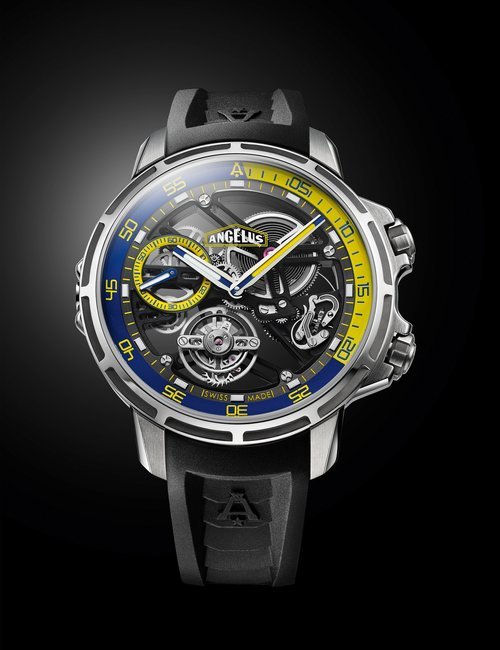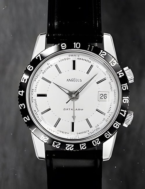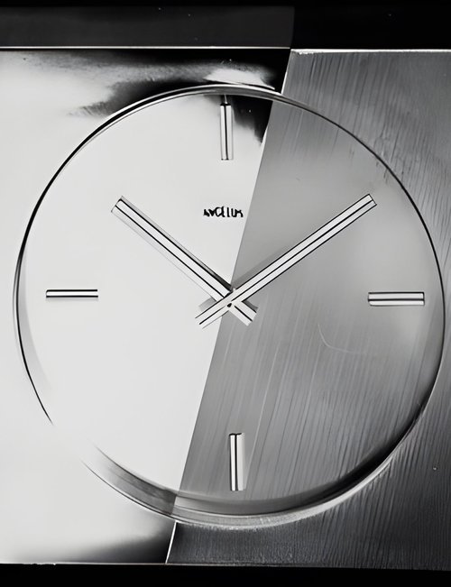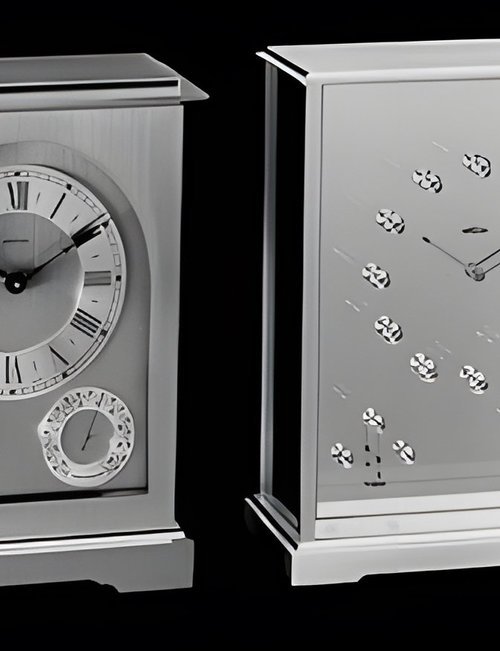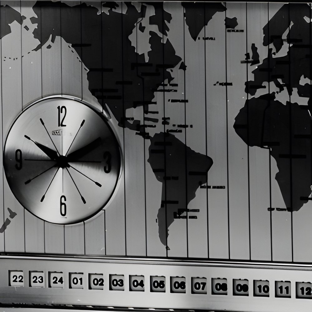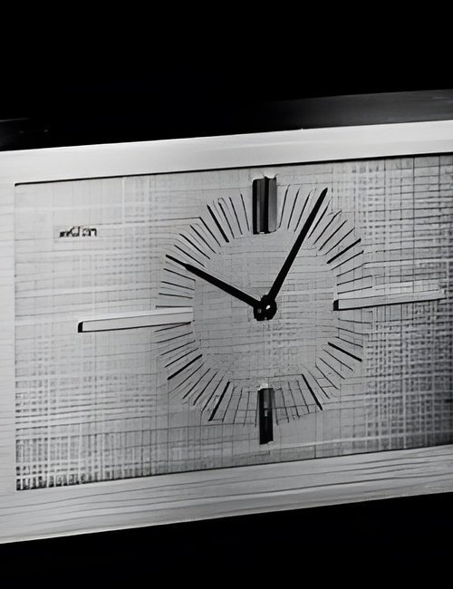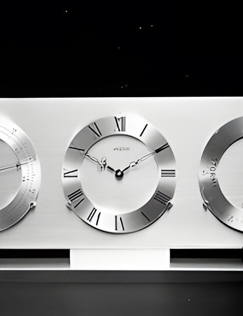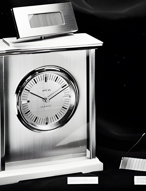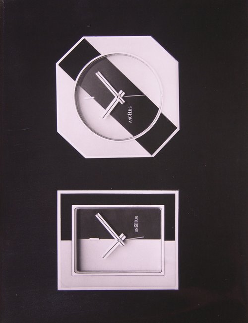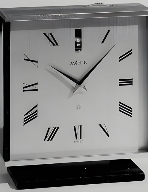 Table clocks are well to the fore in this year ’ s Basle displays. Here, for global time spotting is a desk model which gives automatic readings of all world time zones (ANGELUS)