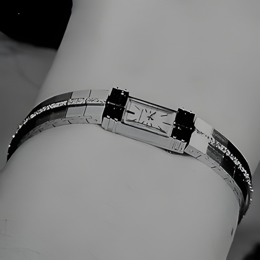 Remember the most fashionable women’ s watches between the wars ? Nearly every one of them was baguette (slim rectangular) in shape. Now the baguette is back with a bang say those arbiters of timekeeping taste, the Watchmakers of Switzerland. At the current Swiss Watch Fair in Basle, where more watches are on display than ever before in one place, baguette stylings arc on most show stands This treatment features an exquisite diamond and sapphire bracelet to add the finishing touch. (Watch by AUDEMARS PIGUET)