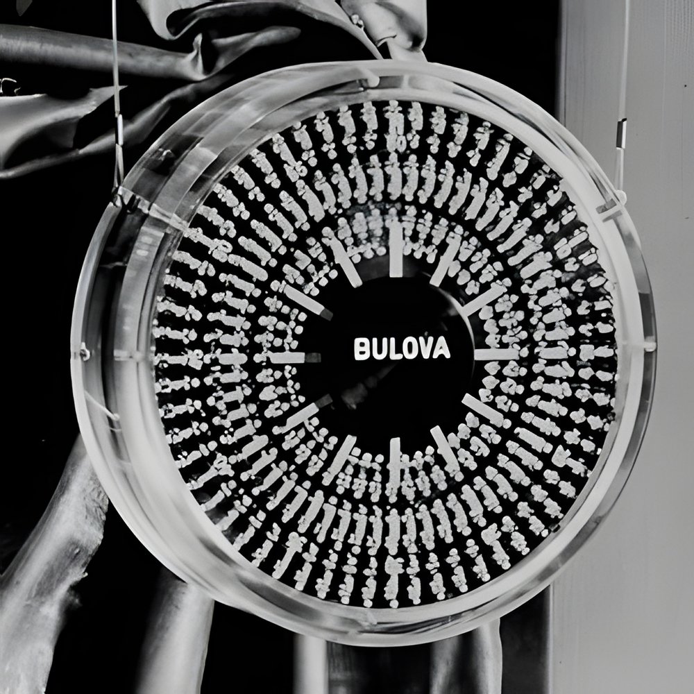 This entirely new all-electronic quartz clock contains no moving parts Time display is carried out by 168 tiny light bulbs each .03 in in diameter and 08 in. long and indicating hours , minutes and seconds The bulbs form part of three ring counters circuited on the dialplate0 Ring counter for the seconds receives second pulses from a 17-stage dual divider which itself is fed by a high precision quartz crystal plate oscillating on 131 e072 cps. The clock runs on rechargeable batteries and can be regulated to an accuracy of 1/100th of a second per day. (BULOVA)