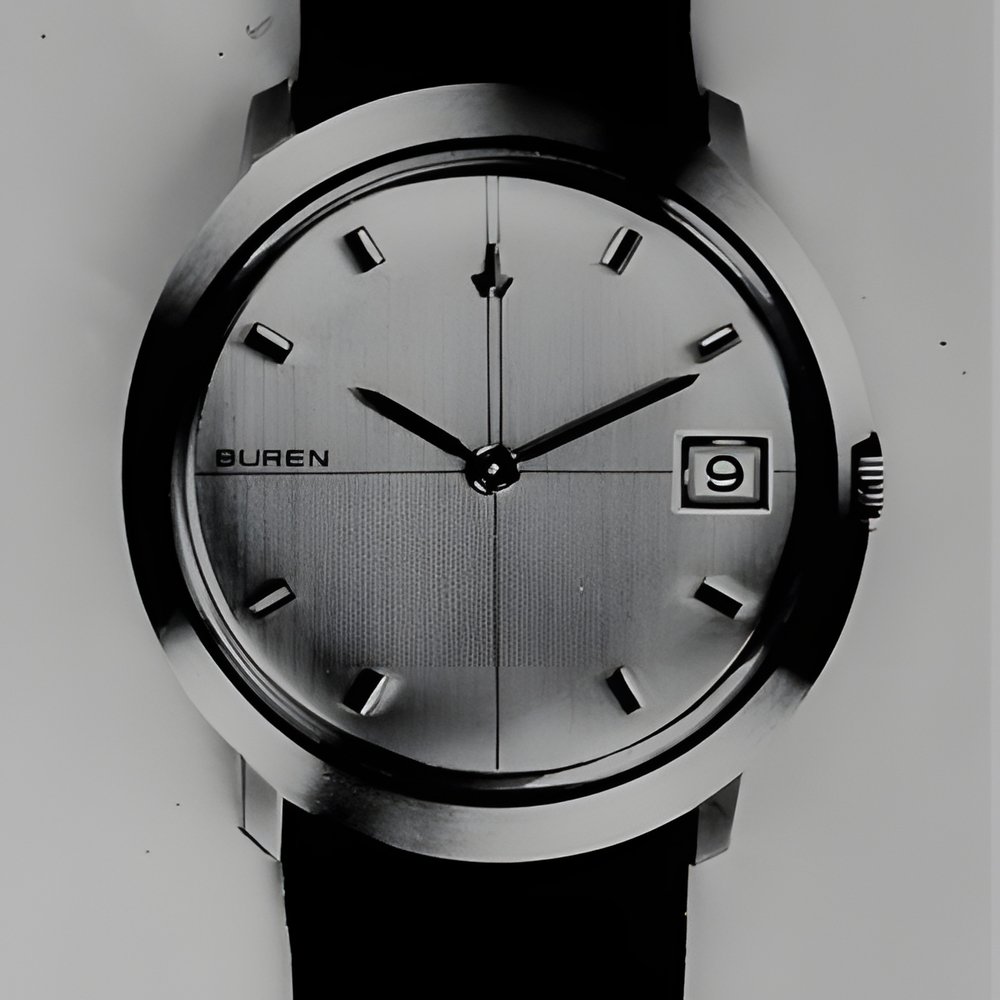 A good example of the Swiss watch industries’ much wider range of slim automatics with calendar. This extra flat model with steel waterproof case incorporates a micro rotor. (BUREN)