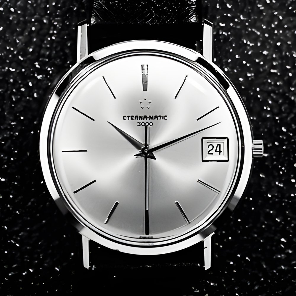 This exceptionally thin automatic watch incorporates an entirely new movement using the famous ball-bearing system now 26 per cent slimmer than its predecessors The date change on the calendar is carried out on the stroke of midnight. The calendar can also be changed manually by a simple movement of the crown. (ETERNA - 3000)
