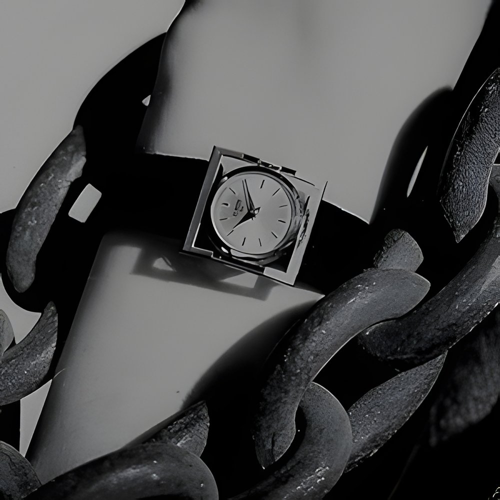Strength of a chain contrasts here with the delicate elegance of this new model taken from the biggest display of watches ever staged the Swiss Watch Fair at Basle (April 20 to 30). The square shape is back, say Swiss watchmakers, but here the designer has cleverly combined it with traditional round dial shape to give a pleasing two in one" effect. (Watch by HENRY MOSER)