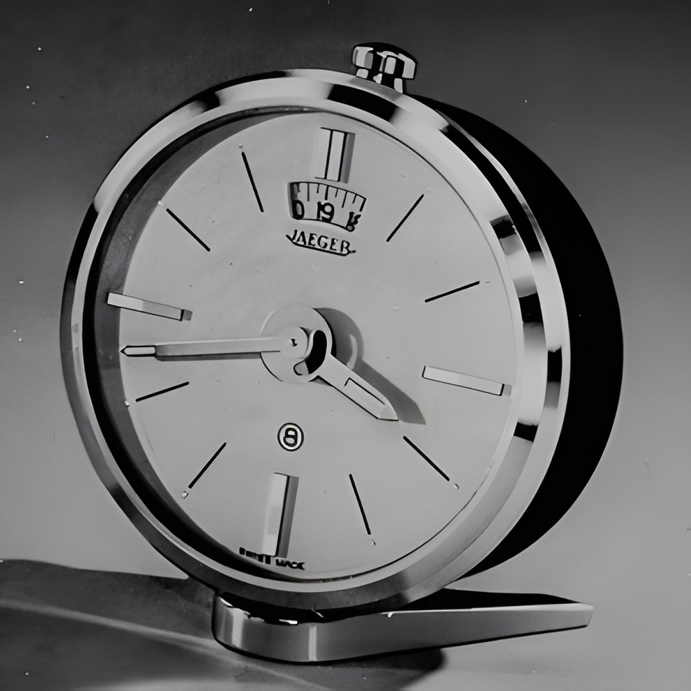 An alarm clock which tells the difference between day and night. This “Recital” model is fitted with a 24-hour alarm system which rings only once daily and needs to be wound and set only once every eight days. One winder serves both the movement and the alarm mechanism and an alarm hand is replaced by a small central window in the dial. A range of models is available. (JAEGER-LECOULTRE)