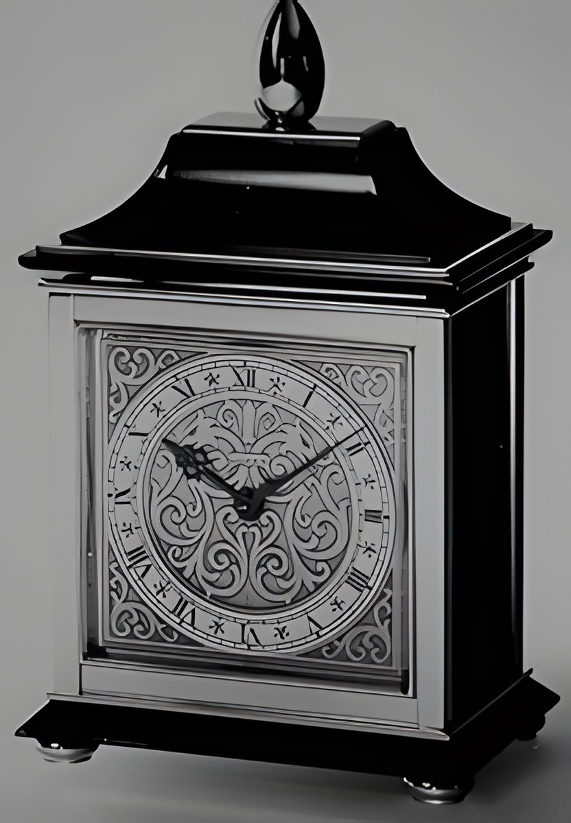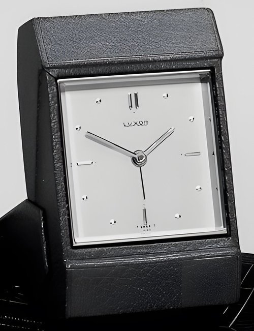 Elegant simplicity of design in this small table clock is backed by a precision eight day movement which strikes half hours and hours. The cabinet is in red or black lacquer. (LUXOR)