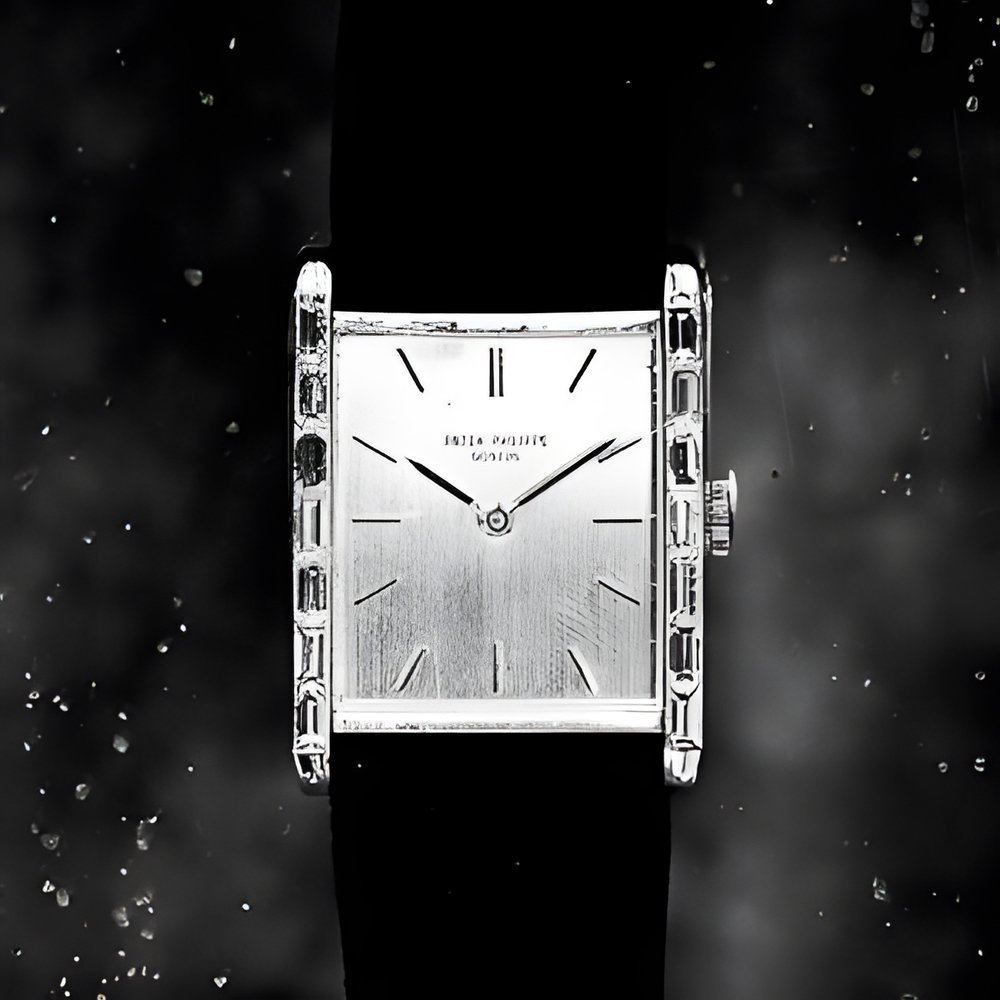 Luxury treatment of the square styling theme which makes such a triumphant return to favour at Basle this year. A superb cocktail watch in platinum, white or yellow gold set with 9 baguette diamonds on either side of the dial. (PATEK PHILIPPE)