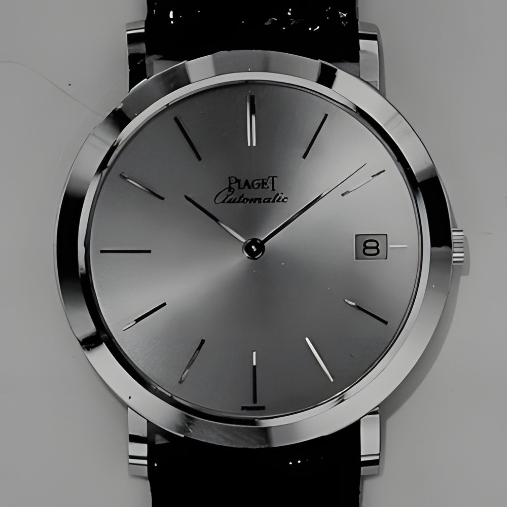 The world s thinnest automatic watch now has a date calondar. This classic gold model has a movement only 28 mm. high while the total height of the watch is only 5 mm. - yet it is fully waterproof,, S oUd gold case , with sapphire glass. (PIAGET)