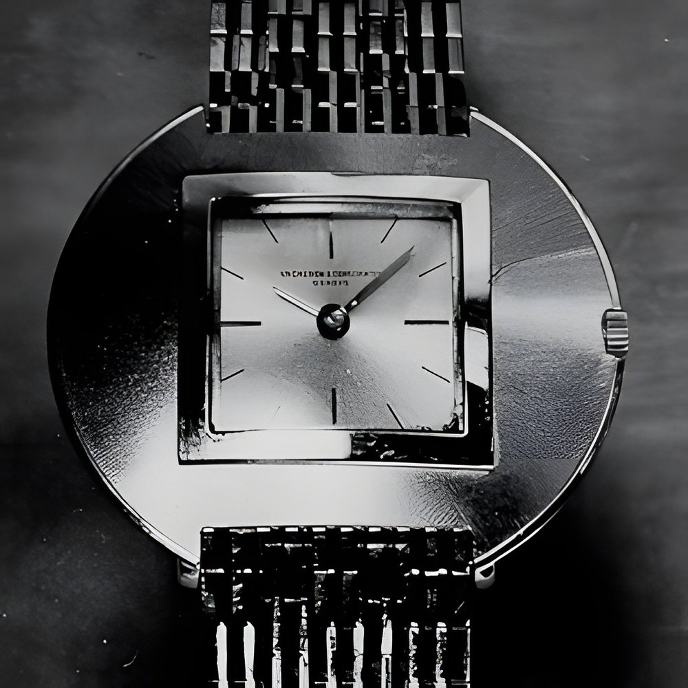 Two new styling trends are cleverly combined in this ultra slim man’s watch. It has a square shaped dial incorporated into a wide circular bezel coin-size in thinness. In 18ct. gold with flexible gold strap. (VACHERON CONSTANTIN)