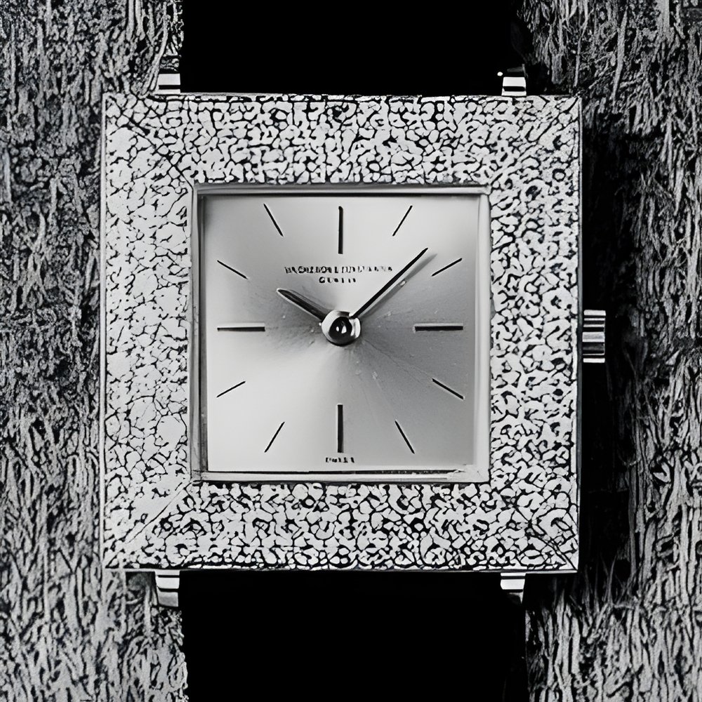 144 diamonds are mounted in the bezel of this superb dress watch which can be worn either by a man or a woman It is in white gold, styled in the highly fashionable square shape (VACHERON CONSTANTIN)
