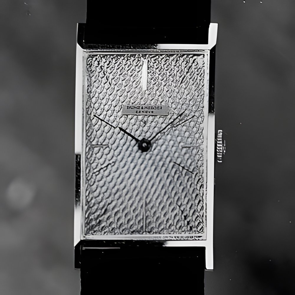 Rectangular, very slim watches for men are very much in style at the moment. This one has extra fine casing lines to set off the “grains of corn” working of the dial area. Exceptionally slim hands and markers. In 18 ct. yellow gold. (Watch by Baume & Mercier)