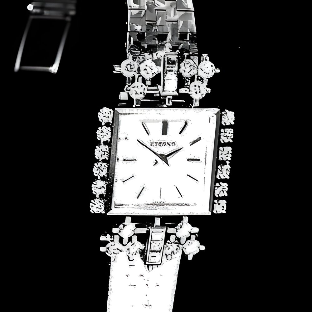 Thirty diamonds adorn this high style grey gold ladies dress watch They are set around the dial and at the junctions between watch and bracelet, giving a gay and delicate feeling. (Watch by Eterna)