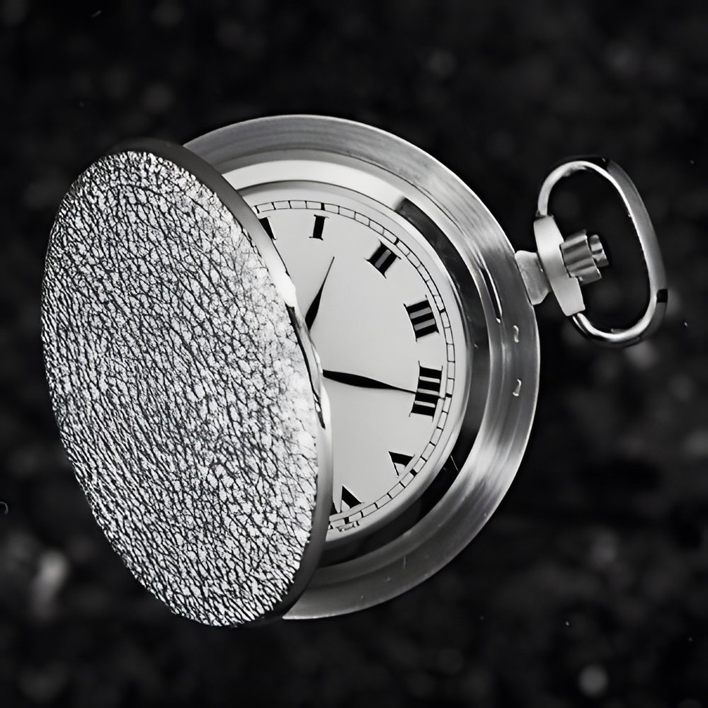 The former no-nonsense sturdiness of the hunter watch has been tapered to high fashion requirements in this razor-slim pocket watch with protective lid. The case is in grey gold and the cover studded with diamonds. Note particularly the enamelled gold dial on which the hours are marked in black Roman numerals. (Watch by Piaget)
