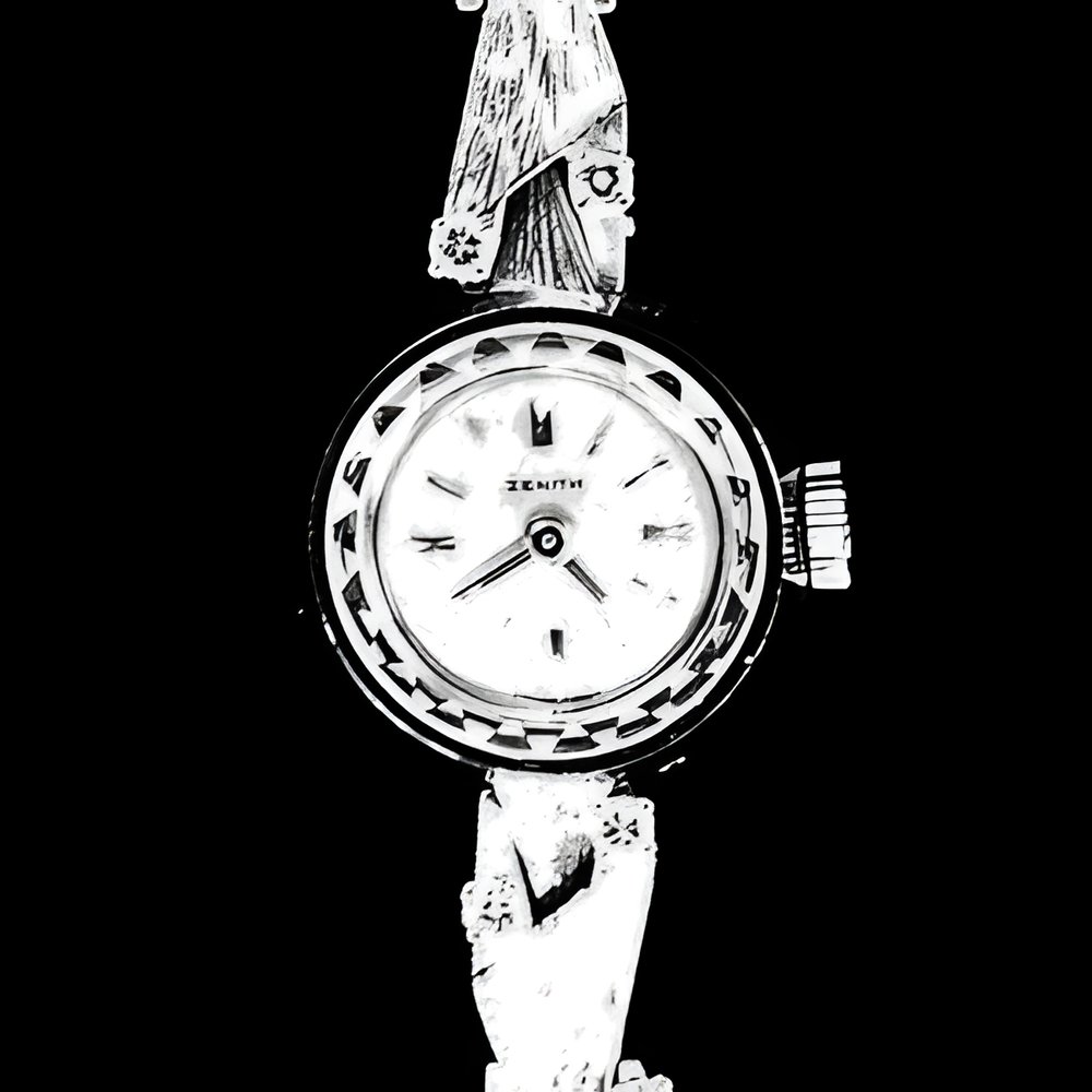 Luxury in miniature : this small jewellery watch is in 18 ct0 grey gold. The links of the bracelet are triangular in shape arid studded with diamonds at the intersections Sapphire crystal. (Watch by Zenith)