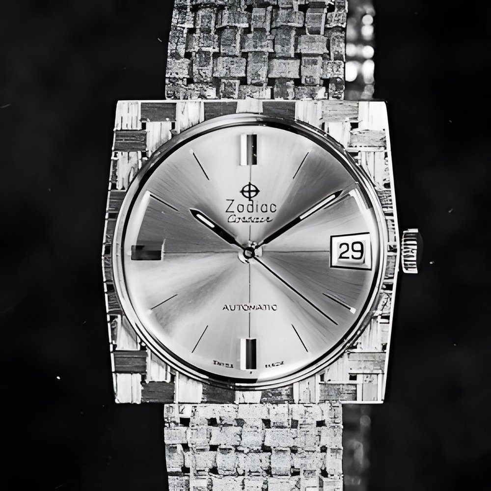Subtly curved bezel of this man’s automatic calendar watch frames a conventional dial treatment,, But bezel and bracelet are avant-garde enough - both are worked in a “woven” treatment In yellow gold. (Watch by Zodiac)