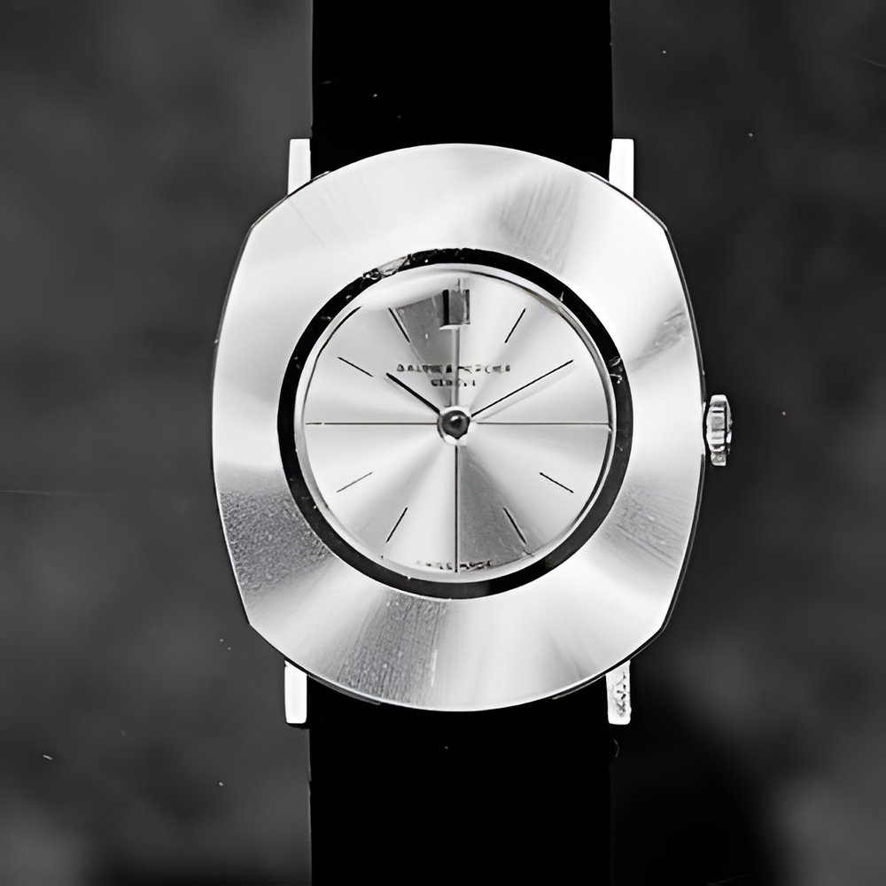 This 18 carat gold watch is an excellent example of several trends that mark this year’ s watch collections It is considerably larger than the ladies’ watches we have been used to seeing over the last few years. The size is both accentuated and lightened by the wide, finely incised bezel, whose unusual lines soften the basically rectangular form. (Baume & Mercier)