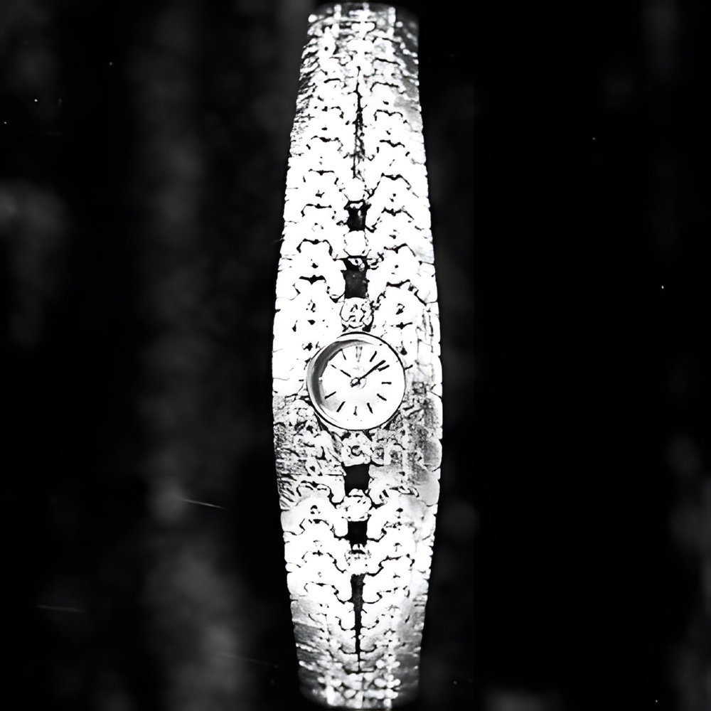 This model is a typical example of the wide, flexible bracelets made of a myriad of tiny pieces joined by light links. Here the bracelet seems to split in two in the centre, held only by six diamonds, until it is open wide enough to contain the small, but very readable watch in its centre. This type of light, supple bracelet is extremely pleasant to wear. (Ebel)