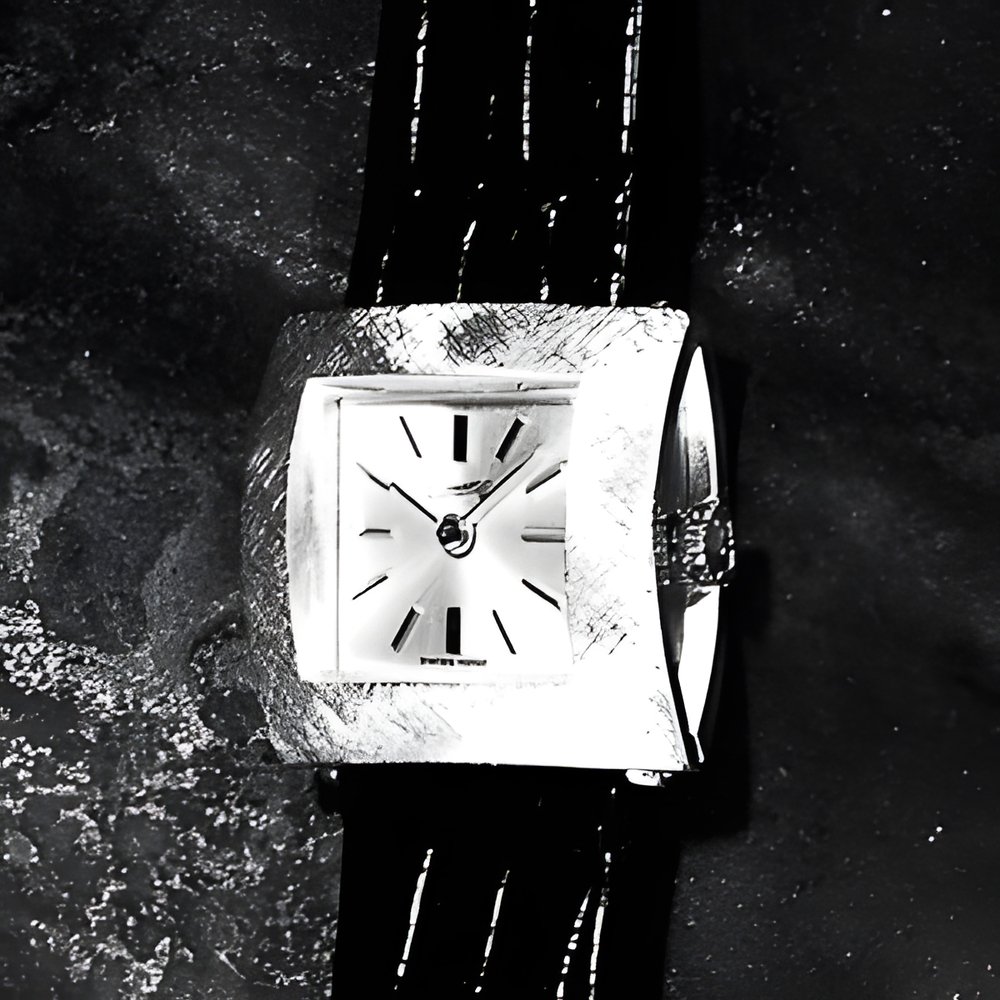 Simple elegance is the outstanding characteristic of this 18carat ladies’ watch. But that simple elegance is underlined by careful detailing, such as the very unusual double curve of the upper and lower surfaces of the case, adapting the watch perf ectly to the wearer’ s wrist, and the wide bezel of Tuscantextured gold, (Eberhard)