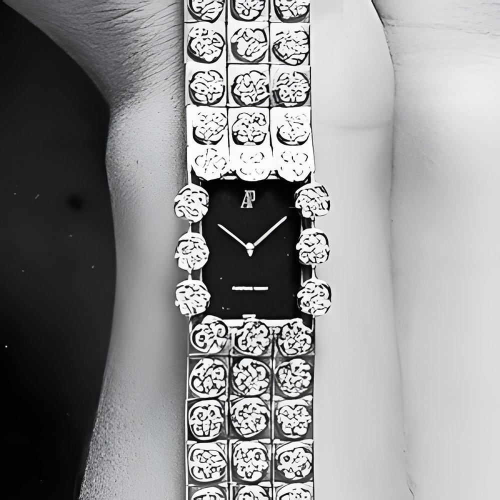 This new Audemars Piguet creation premiered at ??Montres et Bijoux“1974 is a contemporary version of the traditional”diamond riviere", with small brilliants-set squares enhancing a white gold bracelet. The stones weigh 586 carats in all. (AUDEMARS PIGUET)