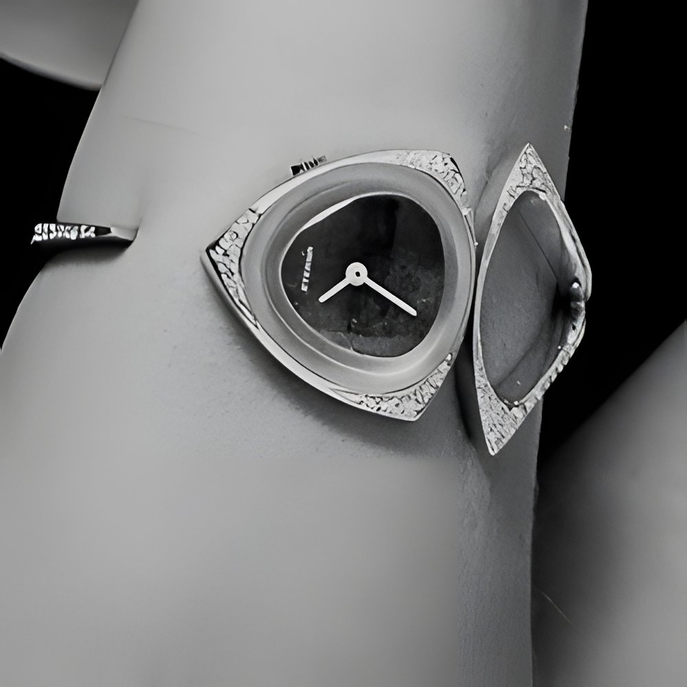 This model, with rigid “slave-type” bracelet, is made of 18 carat white gold. A piece of rock crystal, cut according to a new technique covers the dial and endows the watch with especial distinction. Eterna are thus unveiling a collection notable for new concepts and fine craftsmanship at this year’s “Montres et Bijoux” Exhibition. (ETERNA - Design Collection)