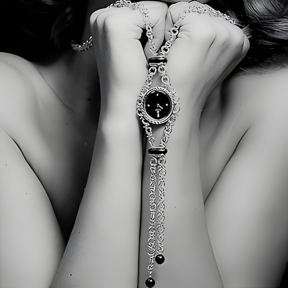 A pendant in 18 carat yellow gold designed by Universal Genève Two long, finely worked chains tipped by onyx spheres frame a watch whose dial is also made of onyx. (UNIVERSAL)