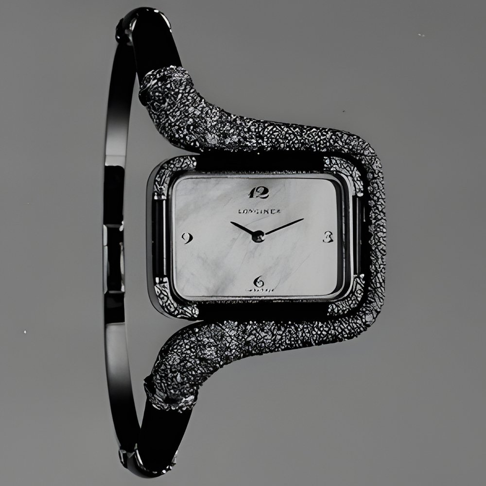 Worn either as a watch or as jewellery, this Longines design features a reversible case displaying a mother-of-pearl dial and a back inlaid with coral and onyx enhanced by diamonds. More diamonds grace the rigid bracelet, contrasting superbly with the onyx decor. (LONGINES)