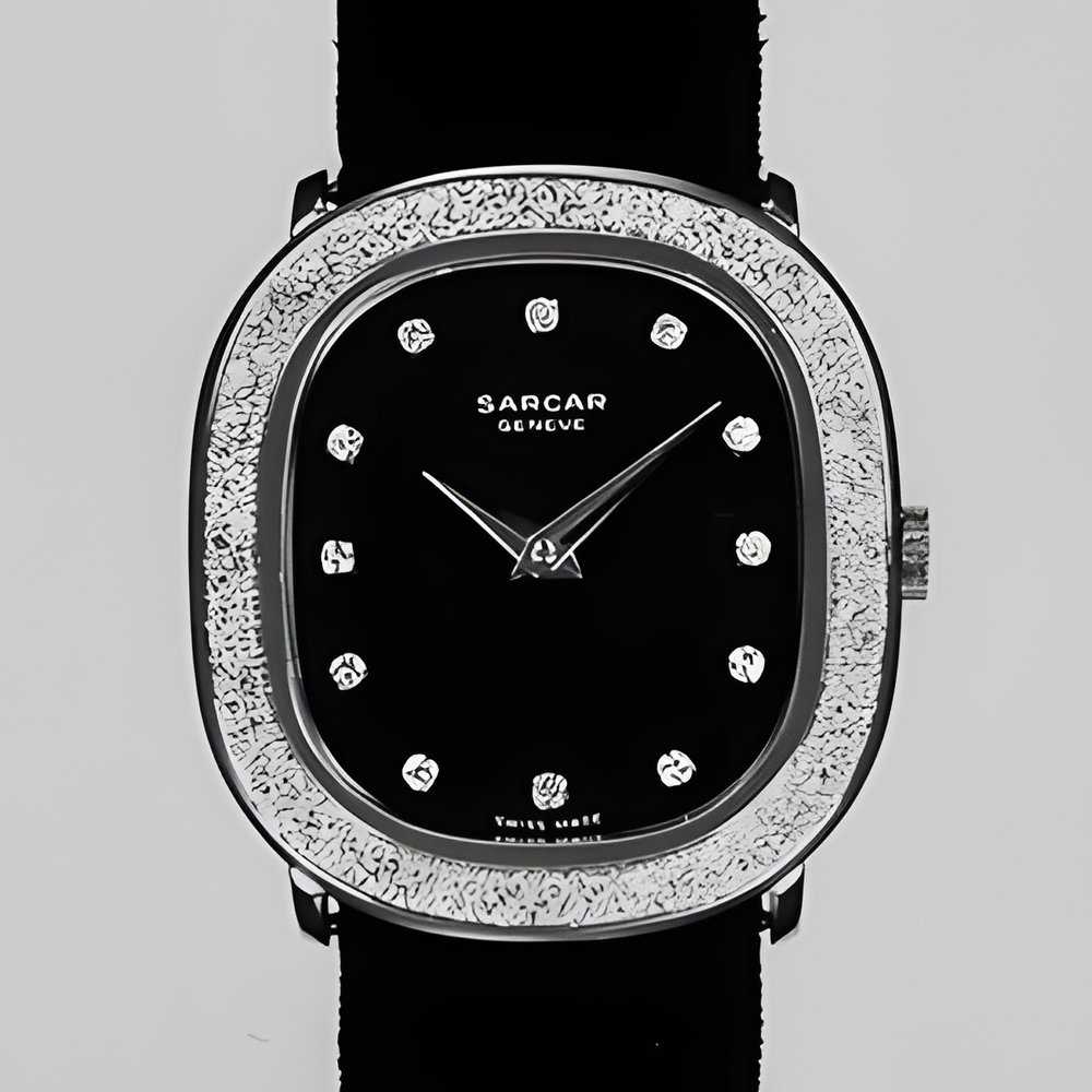 Elegance clear and simple: white gold oval case, diamond-set bezel, black dial with 12 diamond hour-markers. (SARCAR)