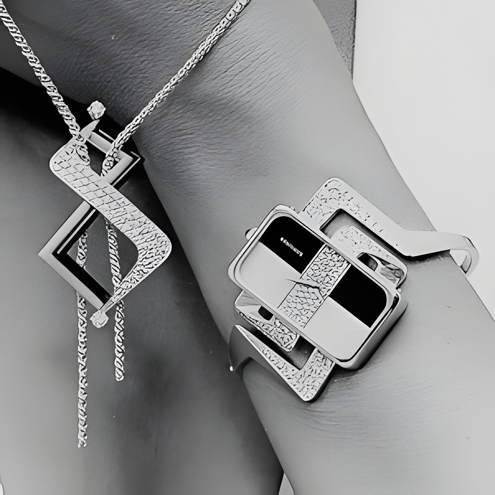 This jewellery ensemble by Longines confirms the shift back to straight lines. Yellow gold areas, set with diamonds, contrast with onyx and coral motifs. The watch boasts a quartz electronic movement. (LONGINES)