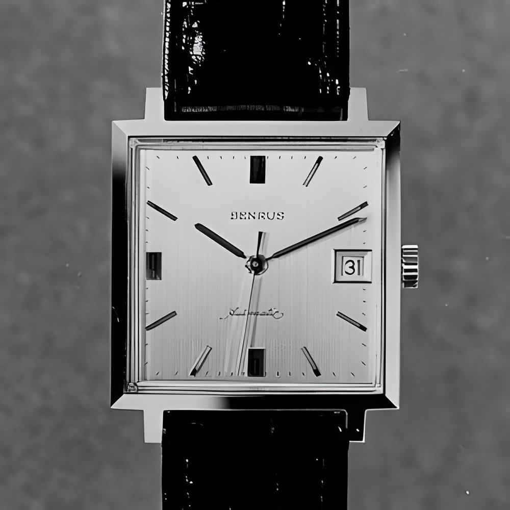 As the popularity of the square shaped watch continues to rise, new waterproofing systems have ensured the full protection of the most up-to-the-minute Swiss stylings. This cleanly styled example, which is fully automatic and incorporates a date calendar, is also completely waterproof through a new protection system specially developed by the Swiss for square cases. (BENRUS)