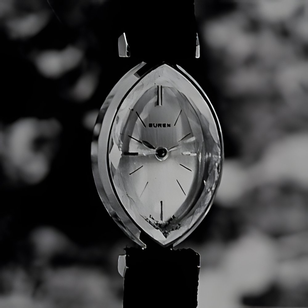 The new Buren 65 movement, fitted to this watch combines the best advantages of round calibers (6 ") and shaped calibers ( 4 n) and thus enables the use of a wide variety of case shapes. The balance wheel, which is screwless, has a high rate (21 ,600) giving great precision. Repairs and adjustments are also made easier by the new Isochrori index-assembly. Additional advantage : this small movement has a 52-hour power reserve. (BUREN)