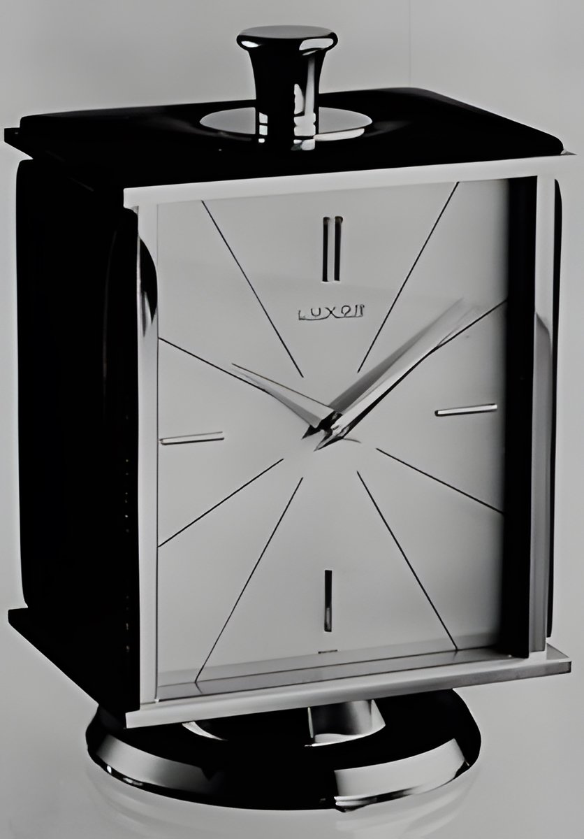 This elegant new table clock, called the “Club” can be turned on its base and is good to look at from any angle, with its distinctive leather-embossed case. It has a seven-jewel battery electric movement, capable of operating a year without battery replacement. Total height is 12.5 cm. (LUXOR)