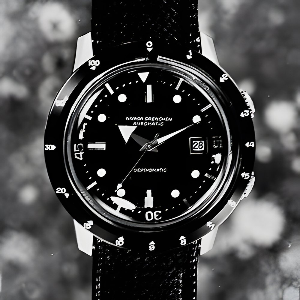 New aid for underwater wanderers - this ingenious divert s watch is the first ever produced with a depth meter around the bezel. Working on the “illuminated strip” system it shows the diver’s depth at a glance. The watch is automatic and also incorporates a date calendar. Guaranteed to high pressures. (NIVADA “Depthomatic”)