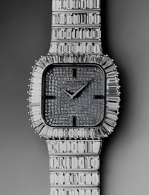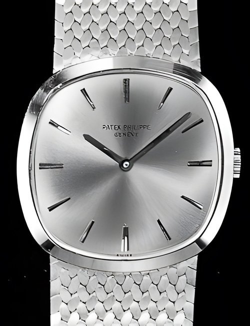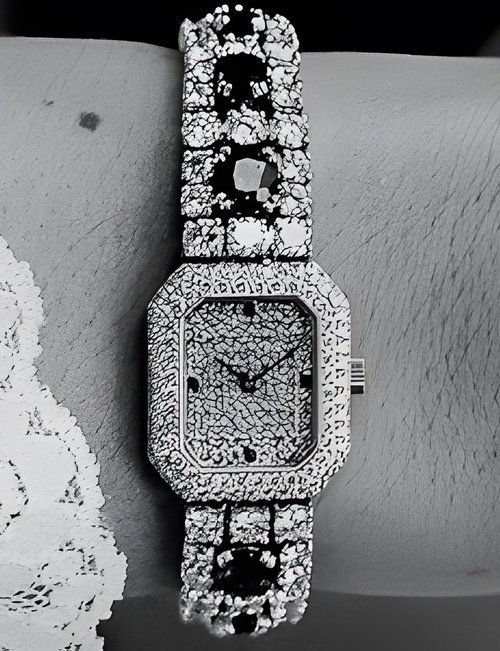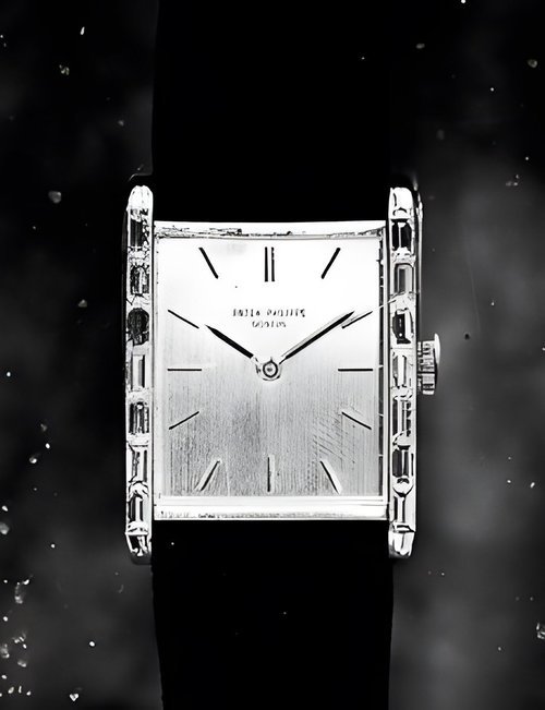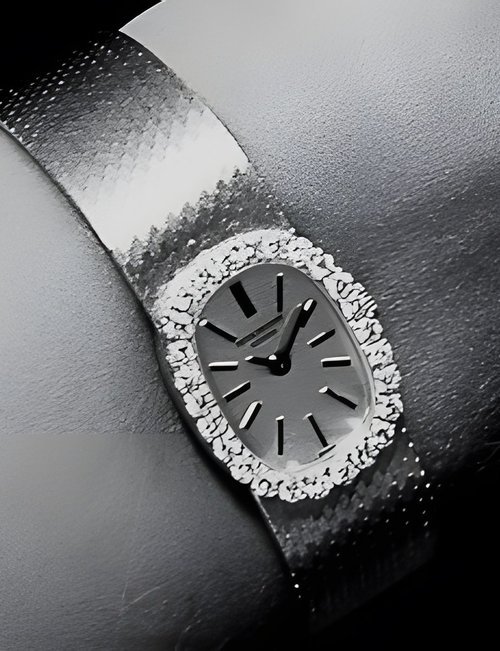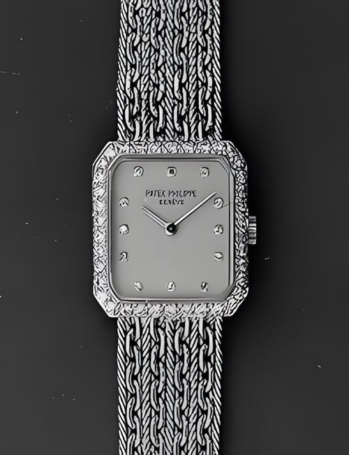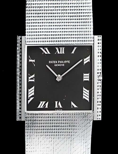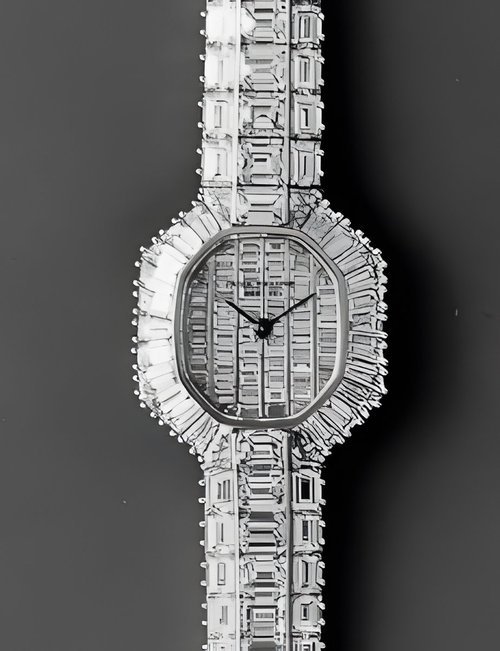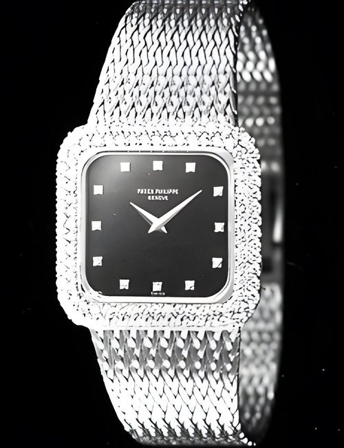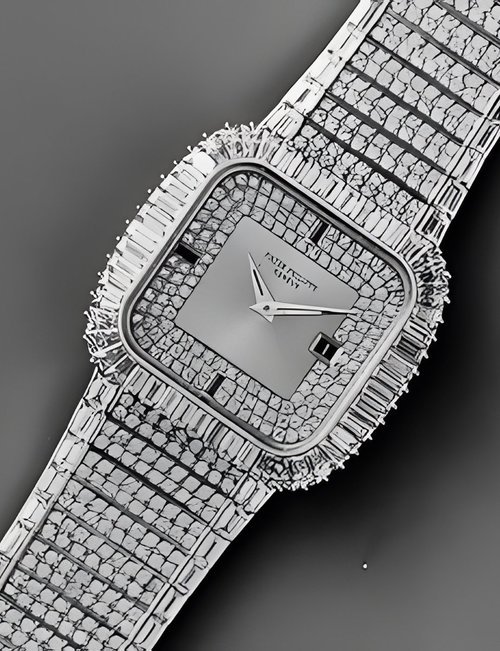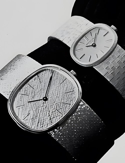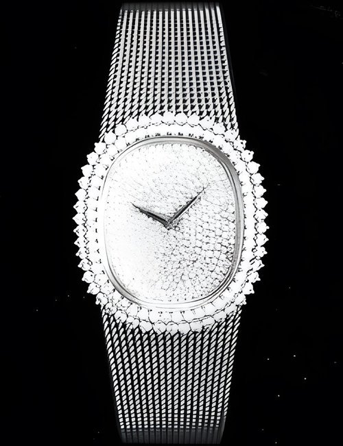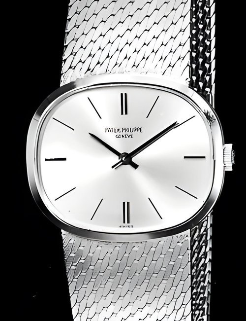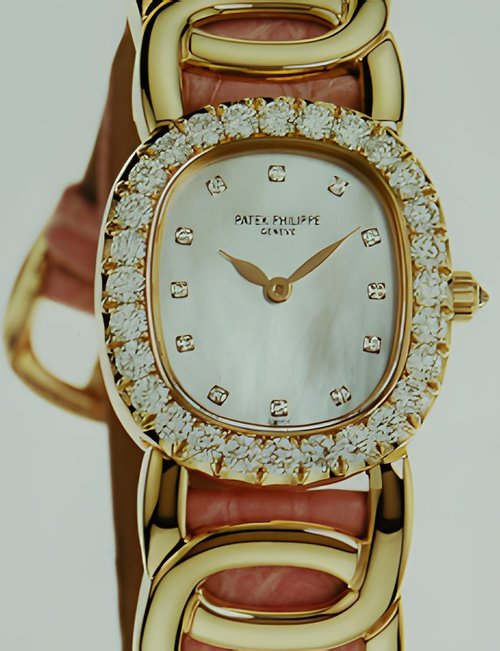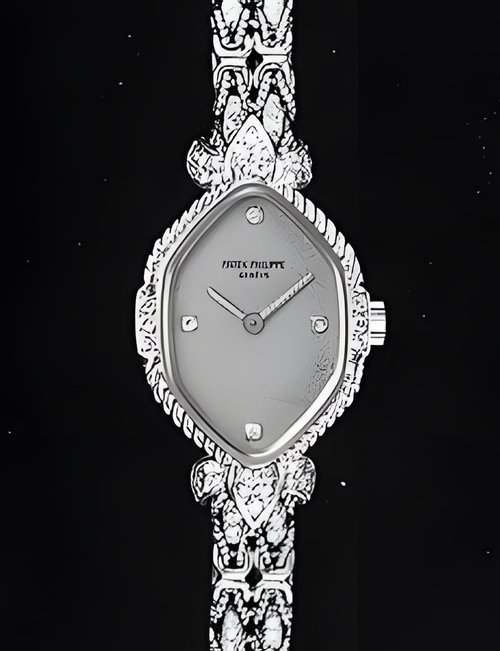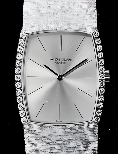 This elegant extra-flat man’s dress watch has an extra distinction: a new movement, caliber 175. The movement has a total height of only 1.75 mm and yet is fully shock proof - the first time that shock protection has been incorporated into such a flat mechanism. In addition it incorporates the new Giromax regulating system which gives greater accuracy. Styling note : the watch is in white gold, oval shaped and set with diamonds. It has a diamond-cut bracelet design. (PATEK PHILIPPE)