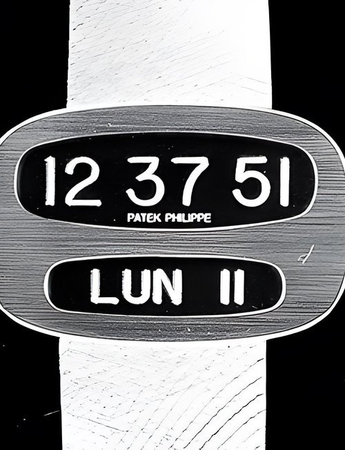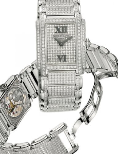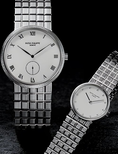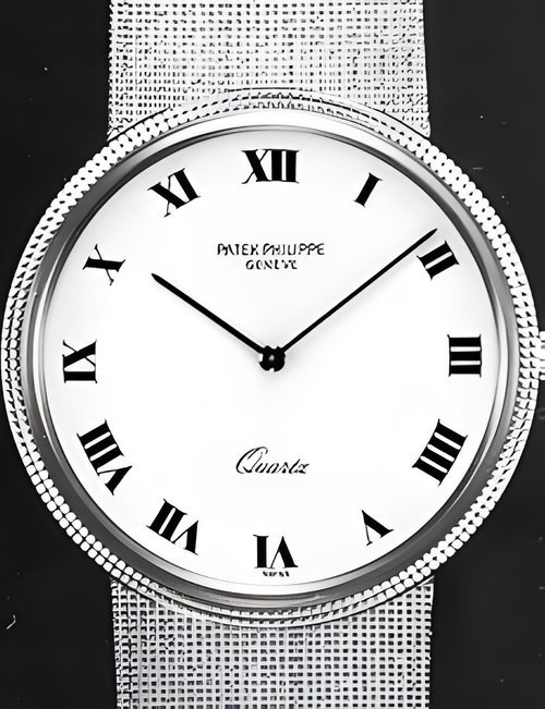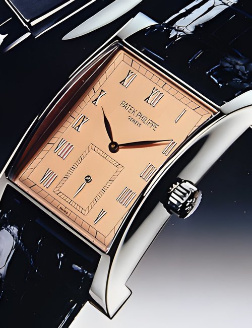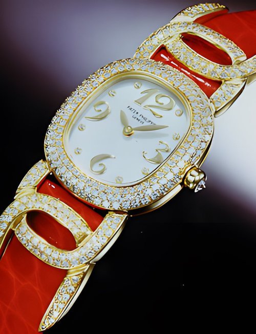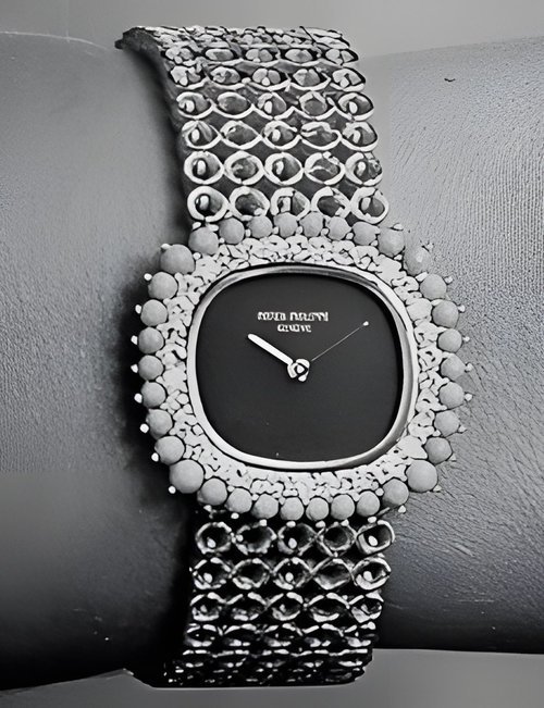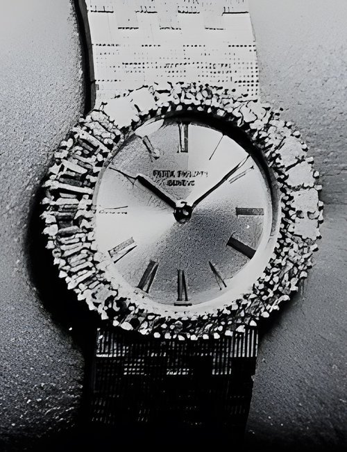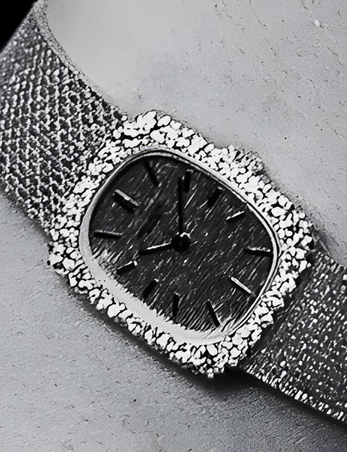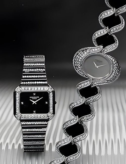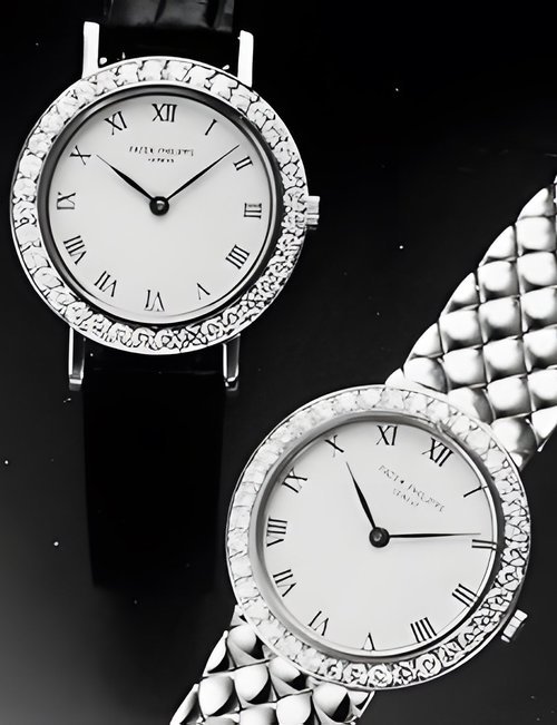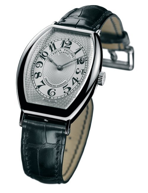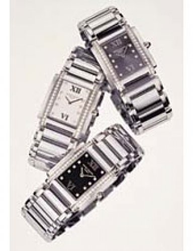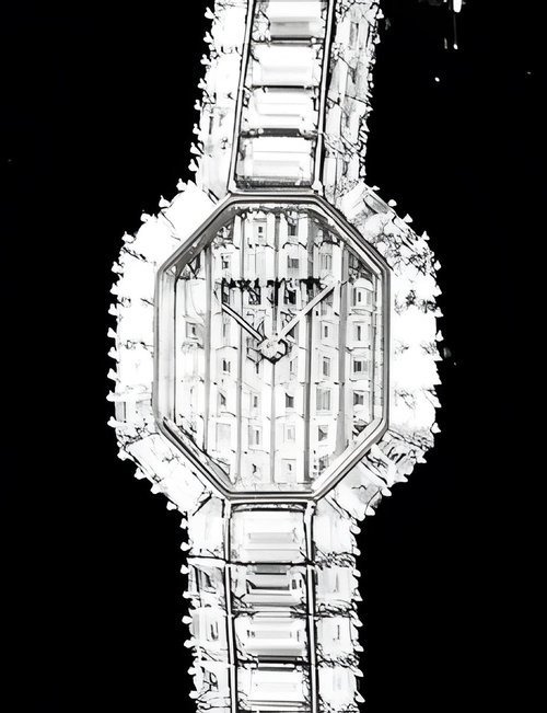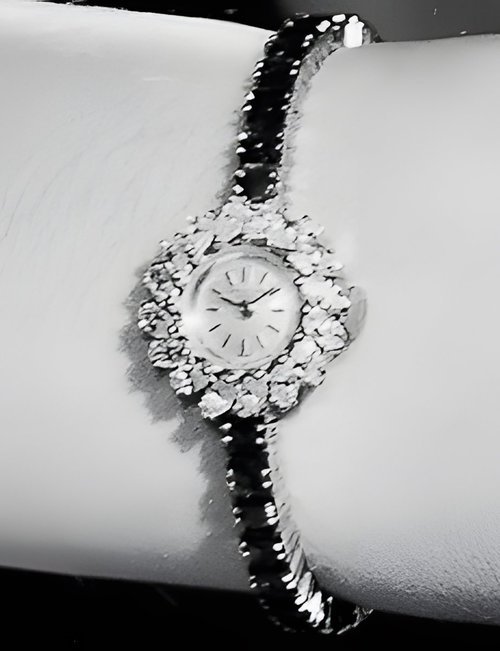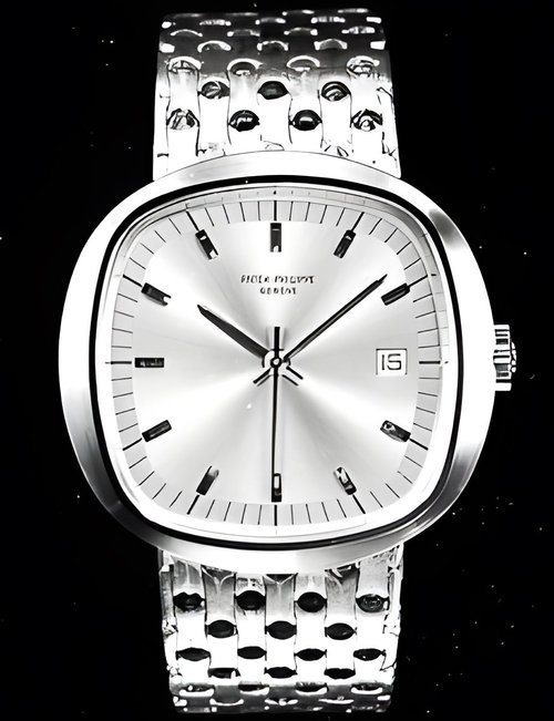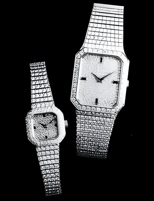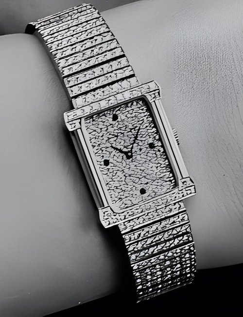 This elegant extra-flat man’s dress watch has an extra distinction: a new movement, caliber 175. The movement has a total height of only 1.75 mm and yet is fully shock proof - the first time that shock protection has been incorporated into such a flat mechanism. In addition it incorporates the new Giromax regulating system which gives greater accuracy. Styling note : the watch is in white gold, oval shaped and set with diamonds. It has a diamond-cut bracelet design. (PATEK PHILIPPE)