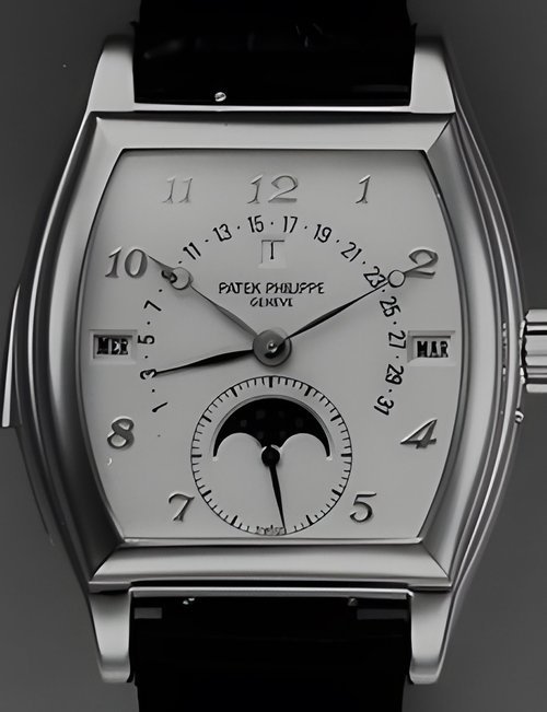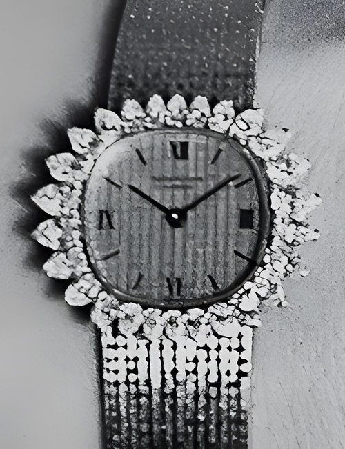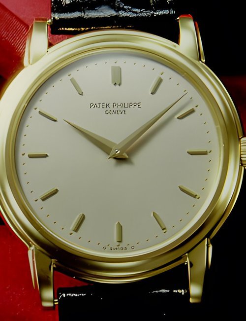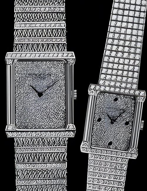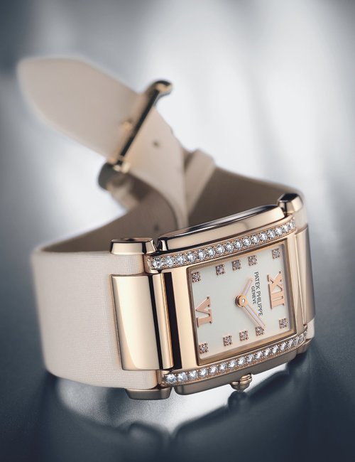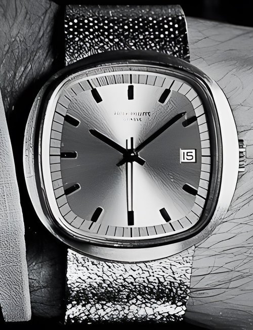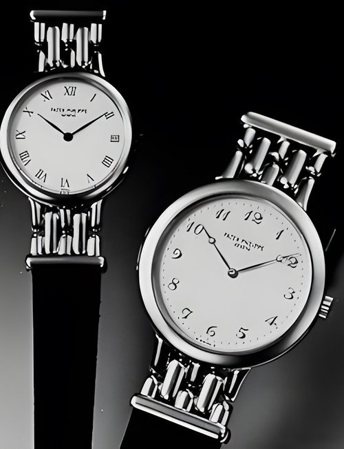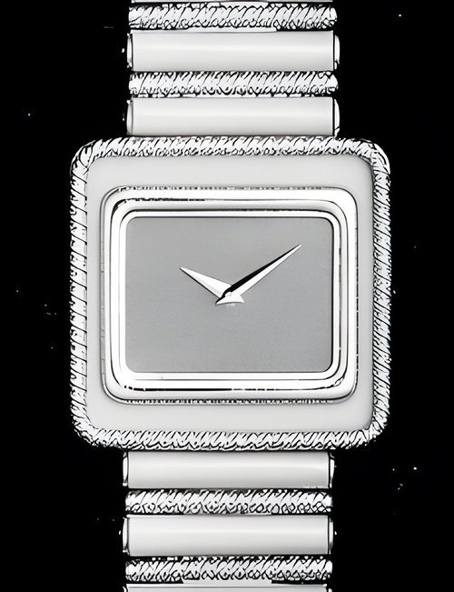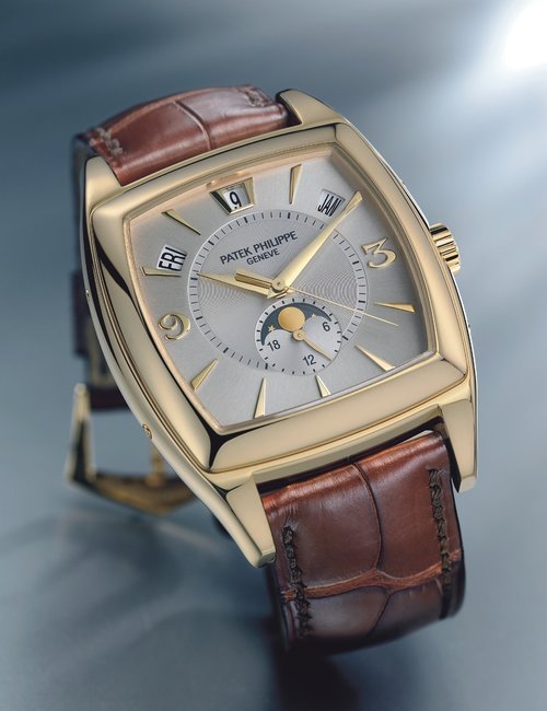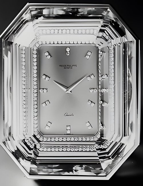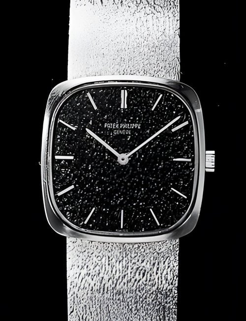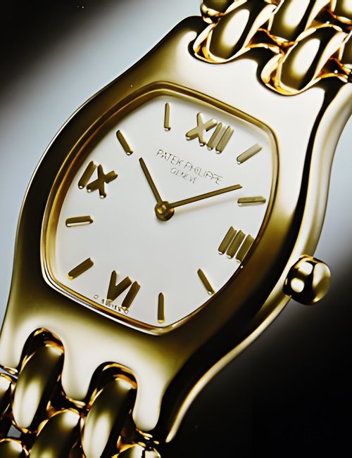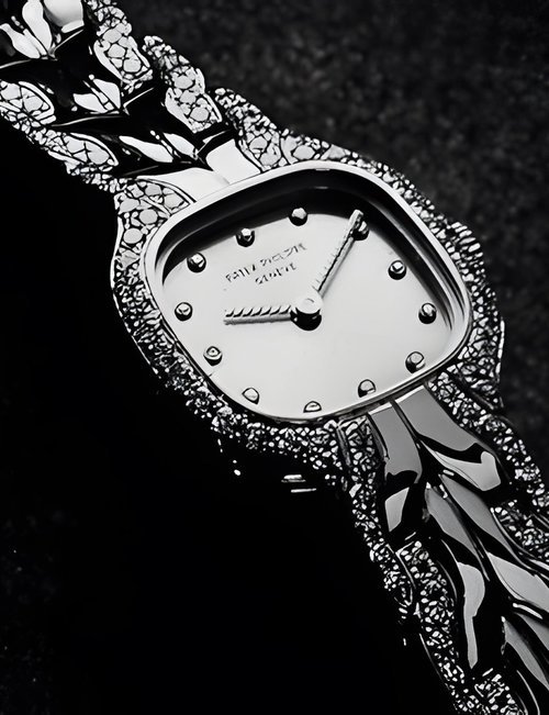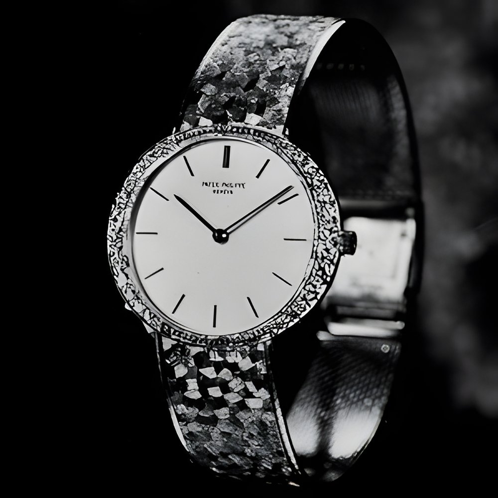 This elegant extra-flat man’s dress watch has an extra distinction: a new movement, caliber 175. The movement has a total height of only 1.75 mm and yet is fully shock proof - the first time that shock protection has been incorporated into such a flat mechanism. In addition it incorporates the new Giromax regulating system which gives greater accuracy. Styling note : the watch is in white gold, oval shaped and set with diamonds. It has a diamond-cut bracelet design. (PATEK PHILIPPE)