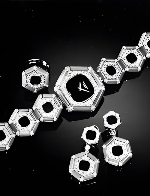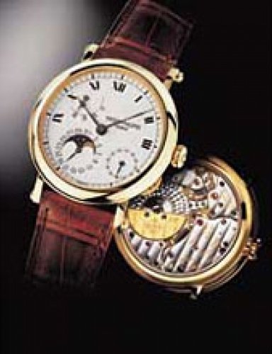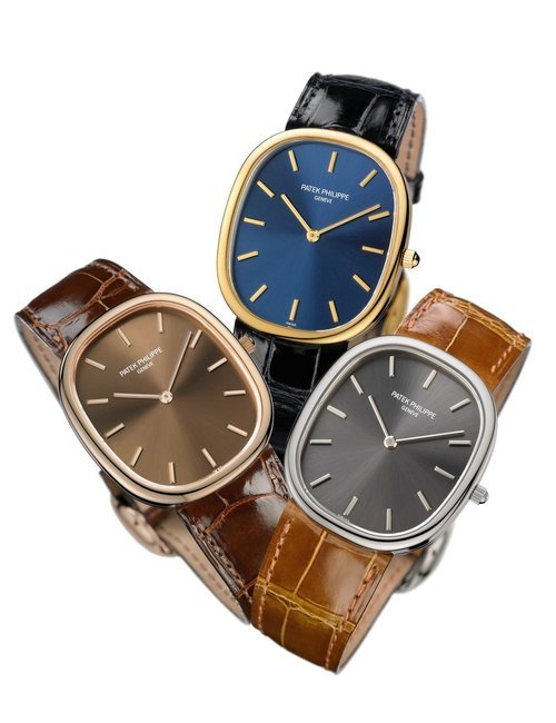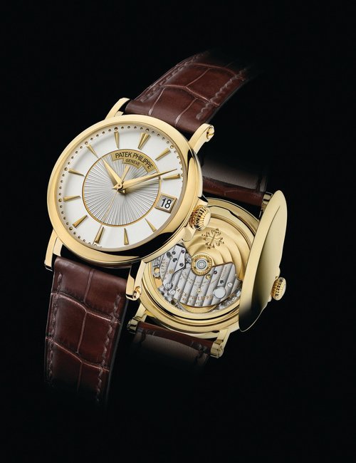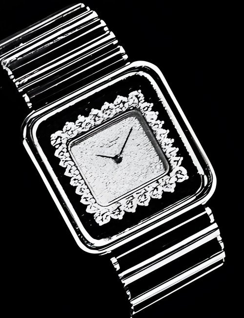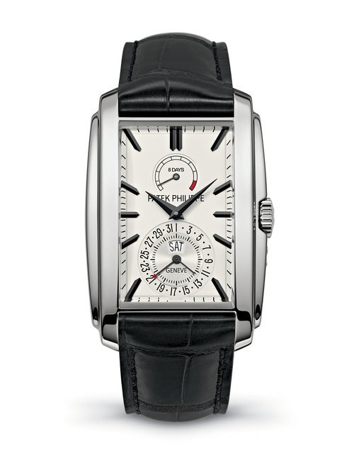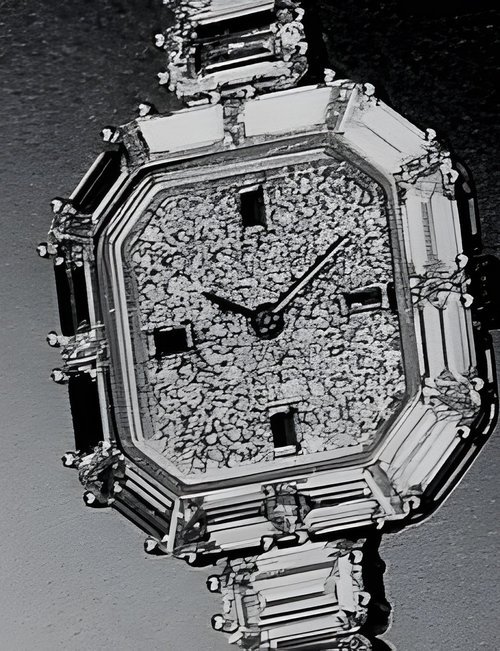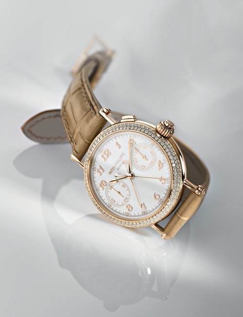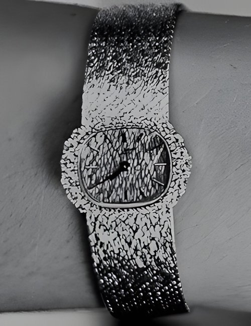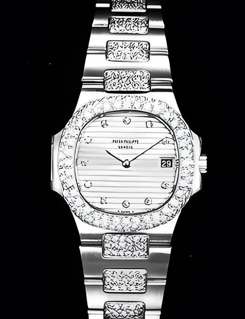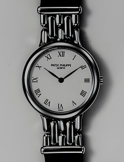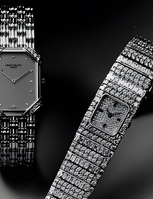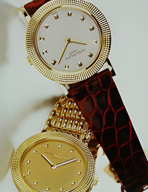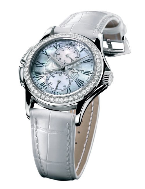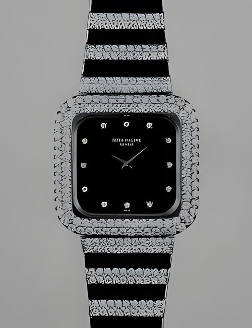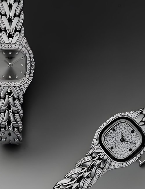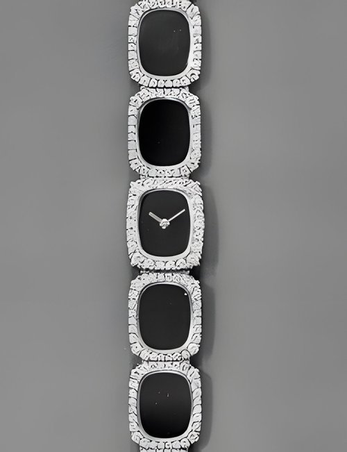This elegant extra-flat man’s dress watch has an extra distinction: a new movement, caliber 175. The movement has a total height of only 1.75 mm and yet is fully shock proof - the first time that shock protection has been incorporated into such a flat mechanism. In addition it incorporates the new Giromax regulating system which gives greater accuracy. Styling note : the watch is in white gold, oval shaped and set with diamonds. It has a diamond-cut bracelet design. (PATEK PHILIPPE)