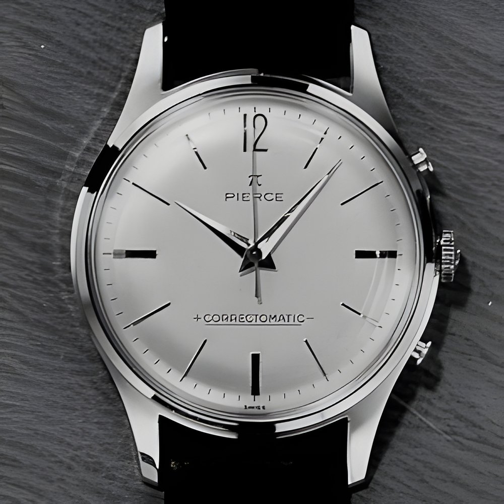 Watch correction problems are made all-too-easy by this ingenious Swiss newcomer. Called the “Correctomatic” it incorporates two regulating buttons above and below the winding crown A touch on the lower button synchronises the watch with for example a radio time signal. And 24 hours later, a touch on the upper button gives automatic regulation of hands and movement - either advance or retard against a time signal. If necessary the regulation can be repeated at will, provided a 24-hour interval from the first correction is observed. (PIERCE “Correctomatic”)