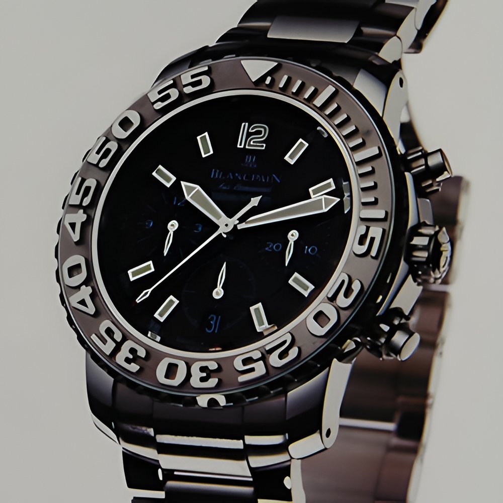 The third model in the Sea-Land-Sky trilogy is Air Command, an extraordinary timekeeping instrument which introduces a new style to prestige watches. This automatic chronograph with a Fly-Back system is fitted with the smallest and flattest movement of its kind, the Blancpain calibre F185, 25.6 mm in diameter and 5.4 mm high. Its ultra-resistant steel case features a screw-down back, protected and screwed crown and push-pieces, and a unidirectional rotating bezel with embossed numbers. Water-resistant to 300 m.