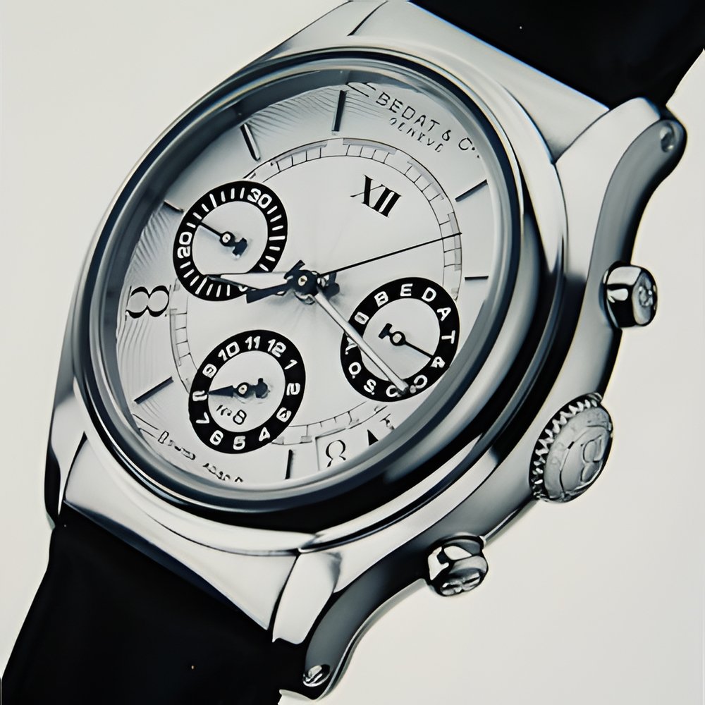 This automatic steel chronograph with its polished and satin-finished steel bezel and screw-down back will appeal to both sexes. It comes with a white dial with hour markers and a minute circle, and on a hand-sewn leather strap. Screw-down crown stamped with BEDAT & C° SWISS A.O.S.C. Exclusive steel BEDAT & C° folding clasp.