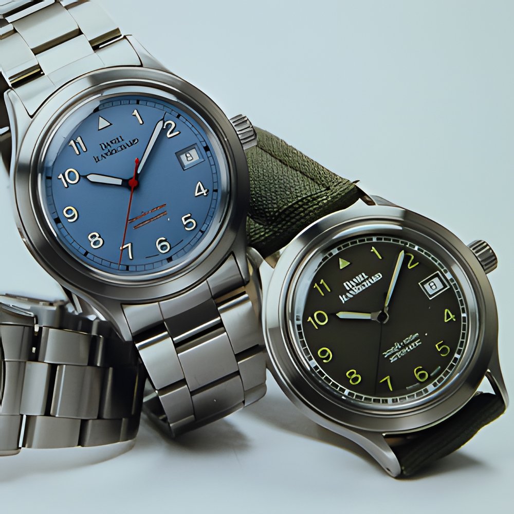 A trio in pastel colours for Daniel JeanRichard’s three new automatic watches: old rose for a chronograph with highly legible silvered counters; pale blue for a model with large shaded numbers and a red centre seconds hand; and army green for the third model. The «Willys» colour of its canvas strap strengthens the collection’s military character.