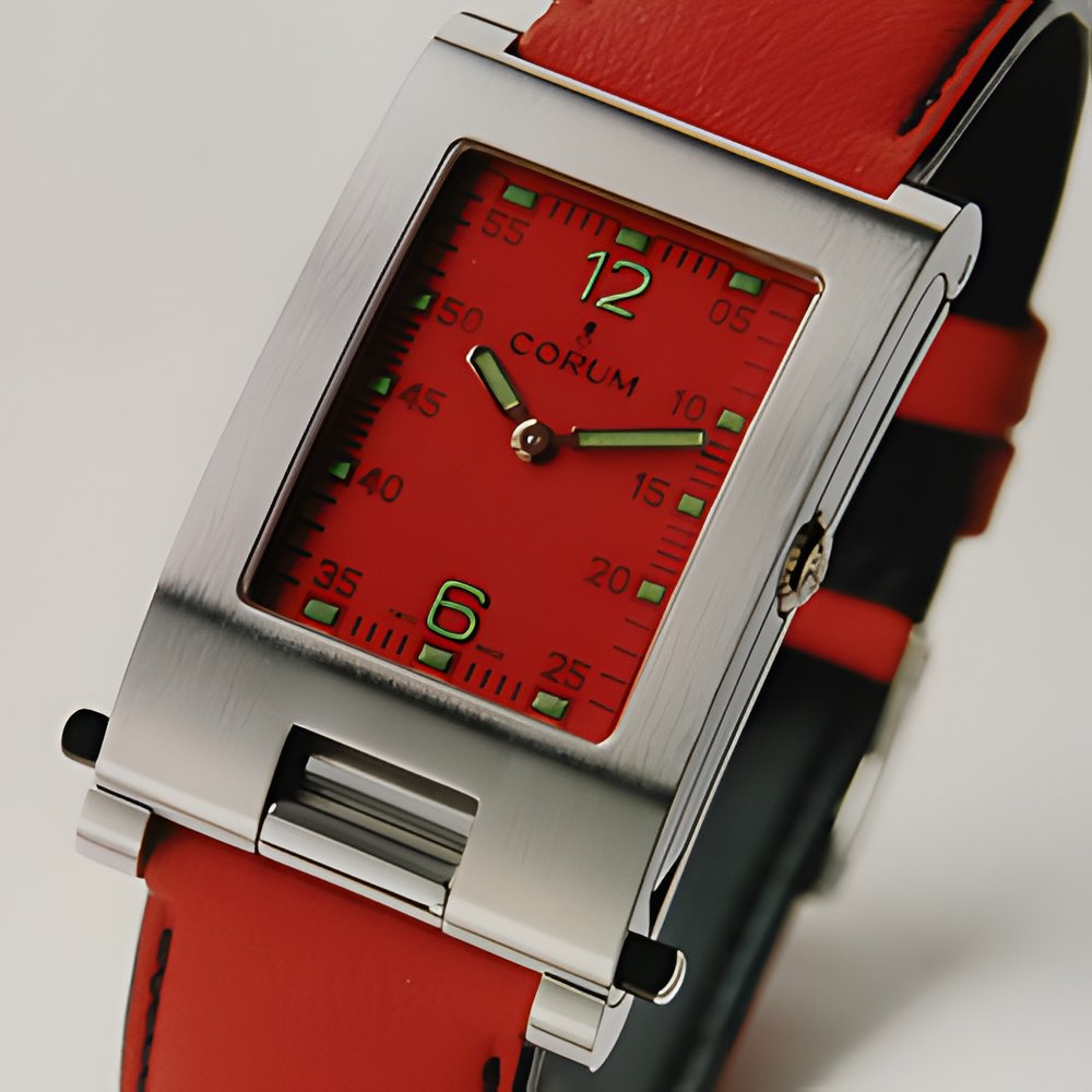 The amazing Tabogan, which can be transformed into a mini-clock by exerting simple pressure on the lateral pushpieces, now takes on a sporty and resolutely insouciant look. The bright red, yellow, blue or green dials, enhanced by luminescent hands, numbers and hour markers, match the colours of the straps. Its water-resistant, stainless steel case with brushed bezel houses a quartz or automatic movement. Alternative choice of silvered dial. Registered model.