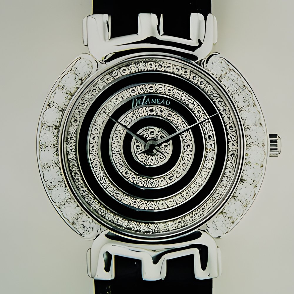 The three circles of diamonds on this man’s watch underscore the onyx zones of the dial. There is a total of 1.40 carats of diamonds on the bezel and 0.55 on the dial. The 750 (18K) white gold case with polished horns houses a quartz movement and comes on a black crocodile strap.