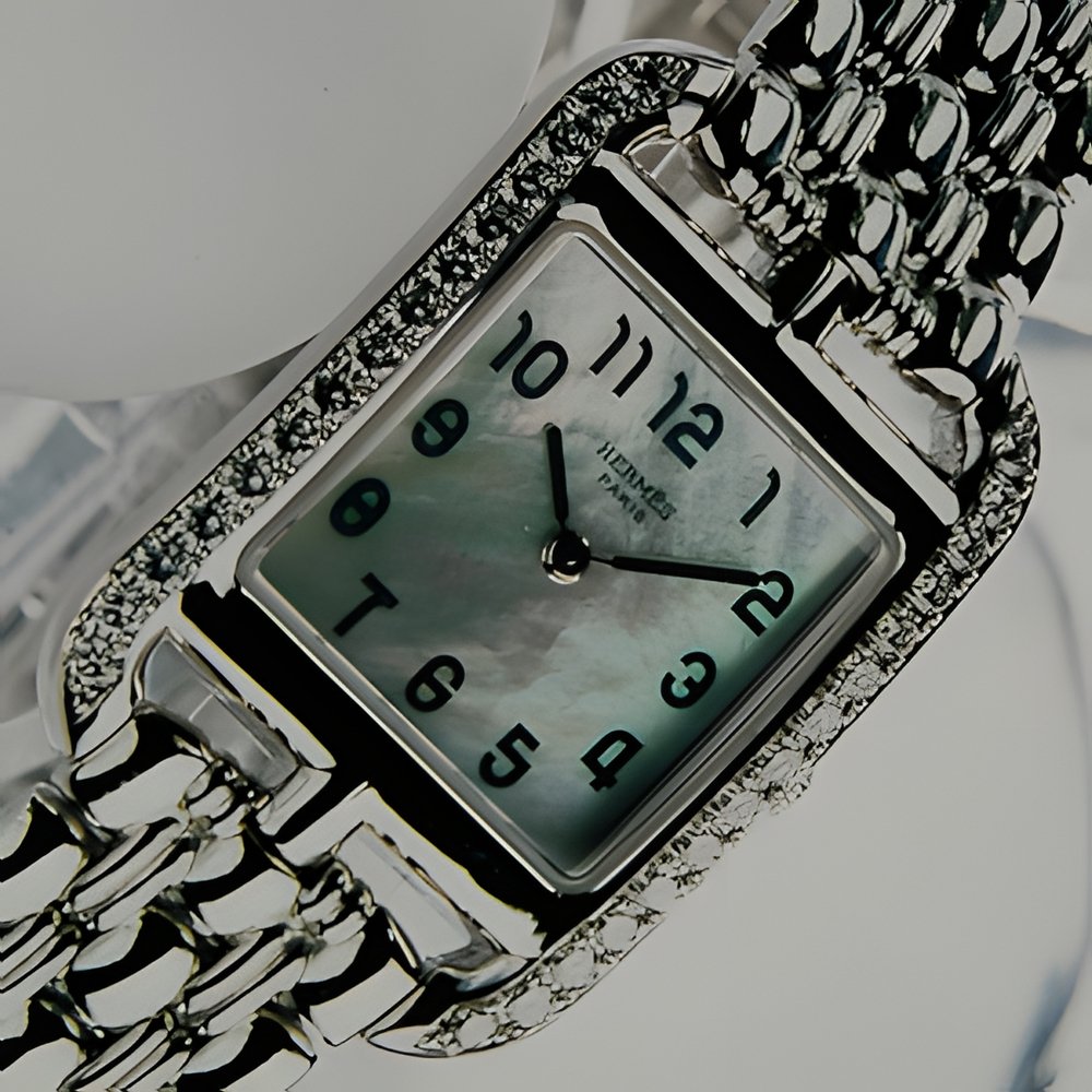 The Cape Cod has been dressed in precious stones and has exchanged its saddle-stitched leather strap for a fine pebble-link gold bracelet. This 750 (18K) white gold watch is also available in yellow gold and with a variety of Top Wesselton VVS1 diamond settings, including a diamond-paved model for very special evenings. Mother-of-pearl dial, sapphire crystal, quartz movement, water-resistant to 30 m.