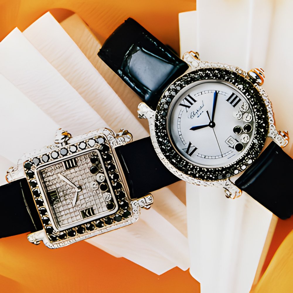 Black diamonds are now featured in the Happy Sport collection, contrasting attractively with 750 (18K) white gold. This square model is set with 214 white diamonds, 32 black diamonds and 5 briolette diamonds, with 7 mobile diamonds, 3 white, 4 black. The round model is set with 80 black diamonds, 67 white diamonds and 5 briolette diamonds, with 7 mobile diamonds, 4 white, 3 black. Sold exclusively at Chopard Boutiques.