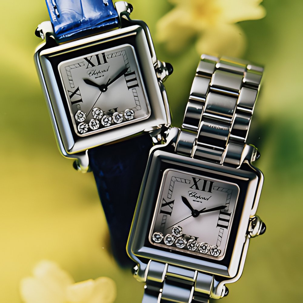 The square version of the Happy Sport line has been designed in steel for the contemporary woman. The case on these models, presented here in the classic version, is set with 5 cabochon sapphires. On the dial, 7 diamonds in little gold shells move freely between two sapphire crystals. Available on a steel link bracelet or a leather strap. Sold exclusively at certain Chopard Boutiques.