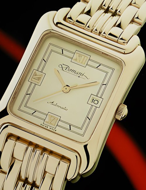 This fascinating watch with its sophisticated decoration can be worn on the wrist or as a pendant on a braided gold chain. Inspired by Etruscan art, it is entirely fashioned in 750 (18K) yellow gold. The case, dial and bracelet can be set with brilliants. ETA 976 quartz movement. Waterresistant to 30 m.