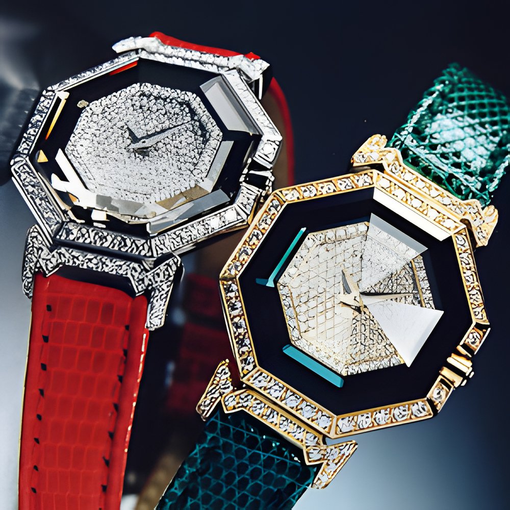 Diamonds are reflected in these transparent hand-polished sapphire crystal cases, palladium-treated on 750 (18K) white gold, or emerald green on 750 (18K) yellow gold. 37 brilliants (0.45 ct) embellish the art deco bezel, with 18 more on each of the attachments. The paved dials are set with 192 brilliants in the centre of a ring of 40 brilliants (total 0.73). Six more decorate the gold loops on the red, green or blue iguana leather strap. ETA quartz movement. Water-resistant to 100 m.