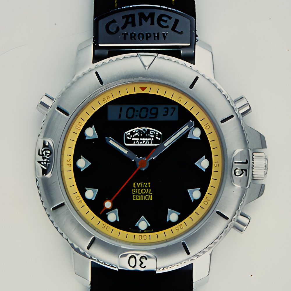 The 1998 Camel Trophy will be held in winter conditions in Patagonia - pure, unadulterated adventure! This year’s official watch with its bright yellow dial and robust features evokes the thrill of strong sensations. The stainless steel case, water-resistant to 100 m, is fitted with a chronograph movement with double-display - analogue and digital - and an alarm function. Highly resistant mineral crystal.