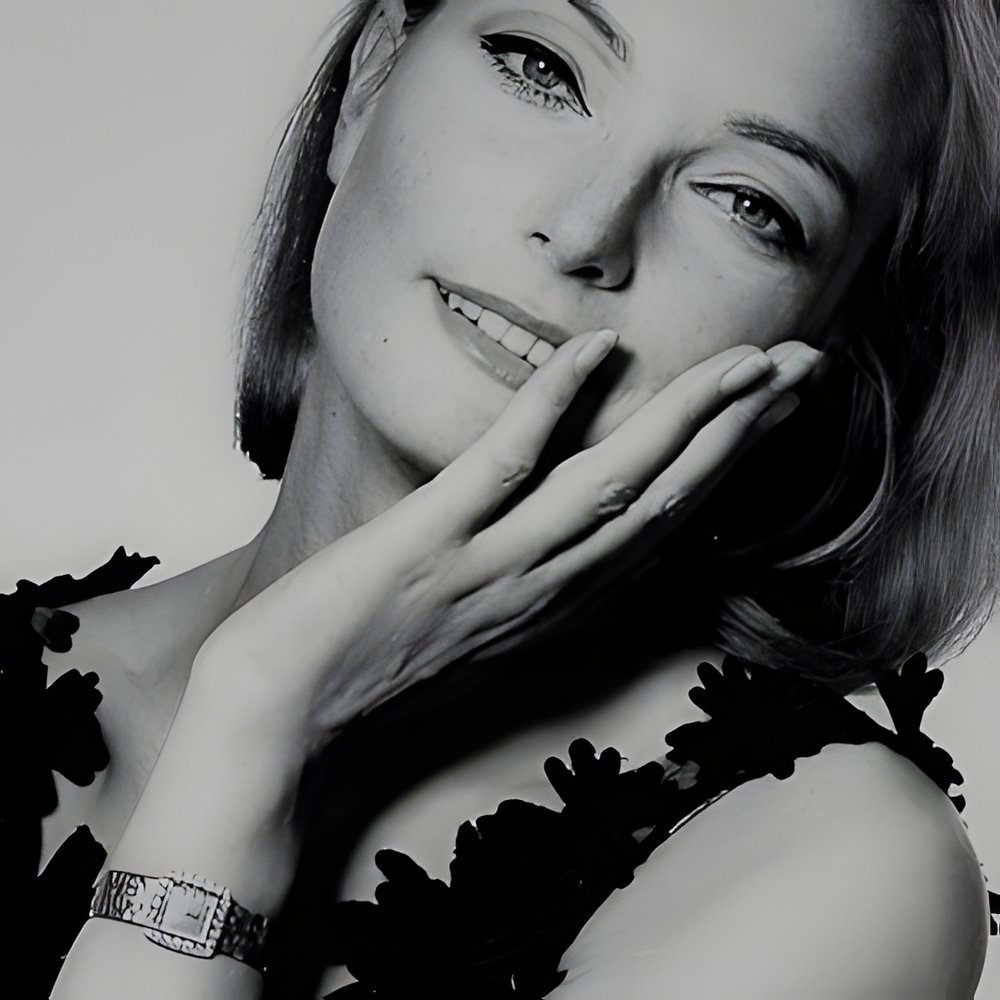 Watch and bracelet in grey gold.. The square case is studd.ed with diamonds circling the dial. By Ebel. Evening dress in black lace by Rose Berlin.